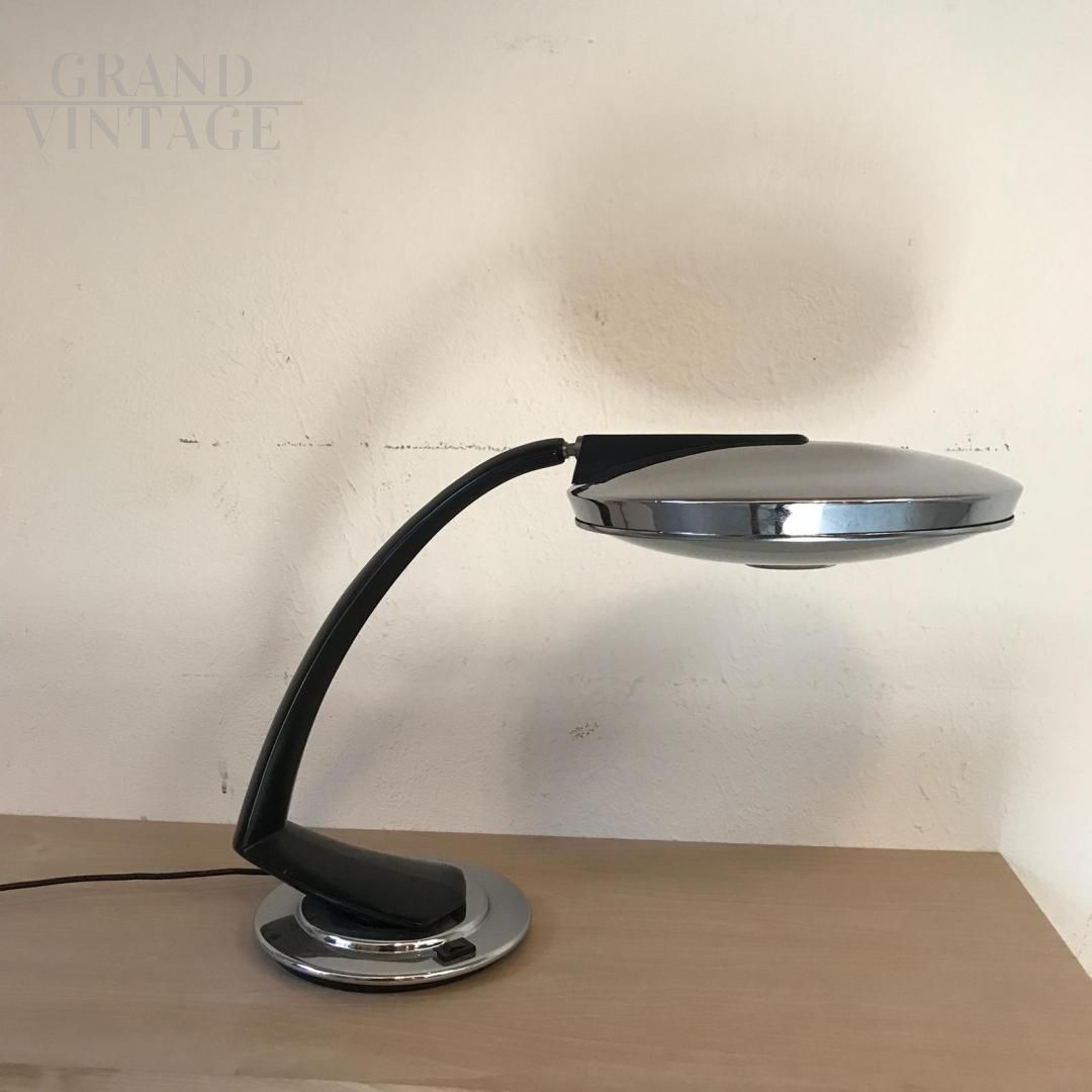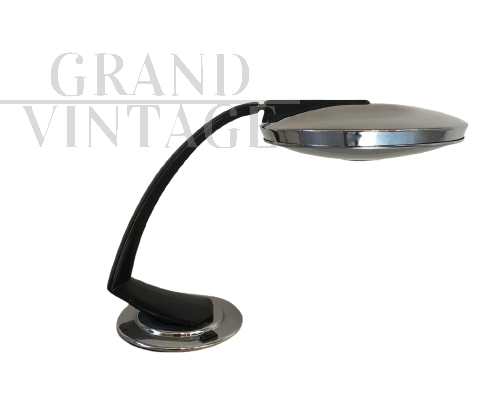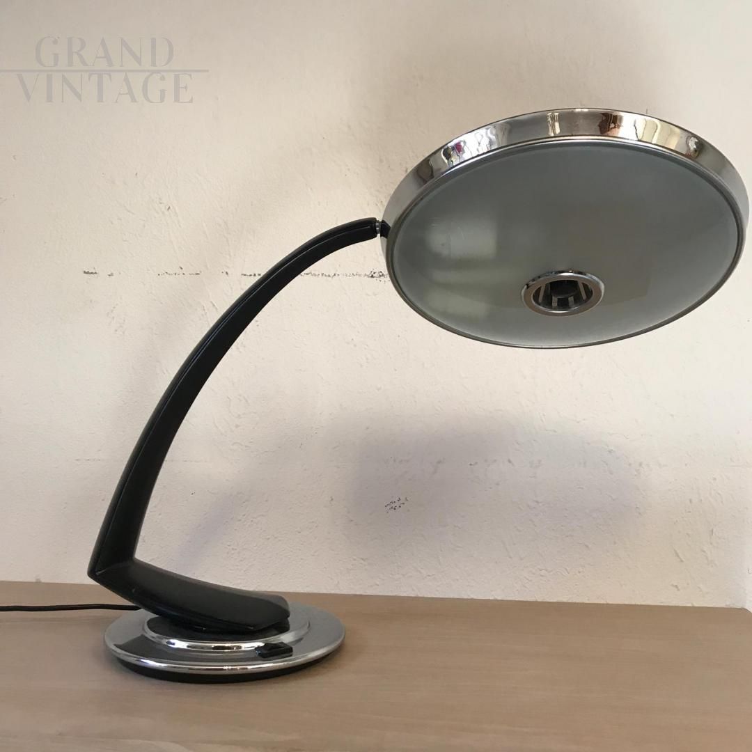 Lampada da tavolo Boomerang dell'azienda spagnola Fase, originale vintage anni '60, con struttura in acciaio anodizzato color nero e testa direzionabile. Presenta i naturali segni del tempo.