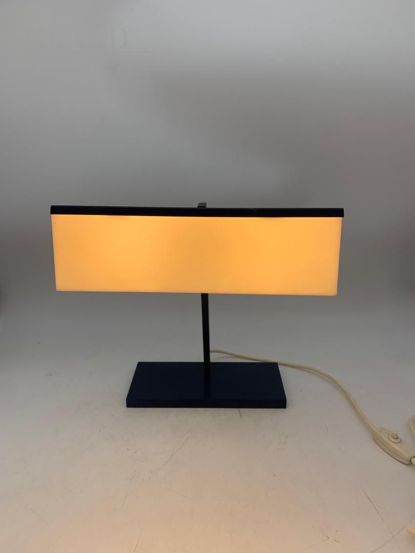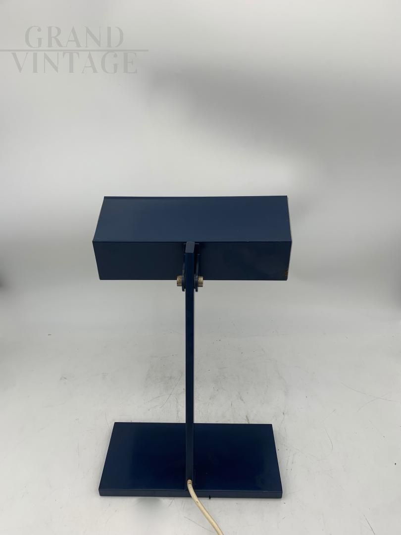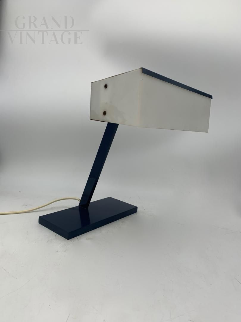 Lampada da tavolo design della ditta Luci con struttura in metallo blu e paralume rettangolare in plastica bianca, Italia anni '70. La lampada ha ancora la spina originale con il marchio Luci, e conserva ancora i colori e le plastiche bianche originali. In buono stato, con qualche naturale segno del tempo. Impianto elettrico originale e funzionante.