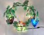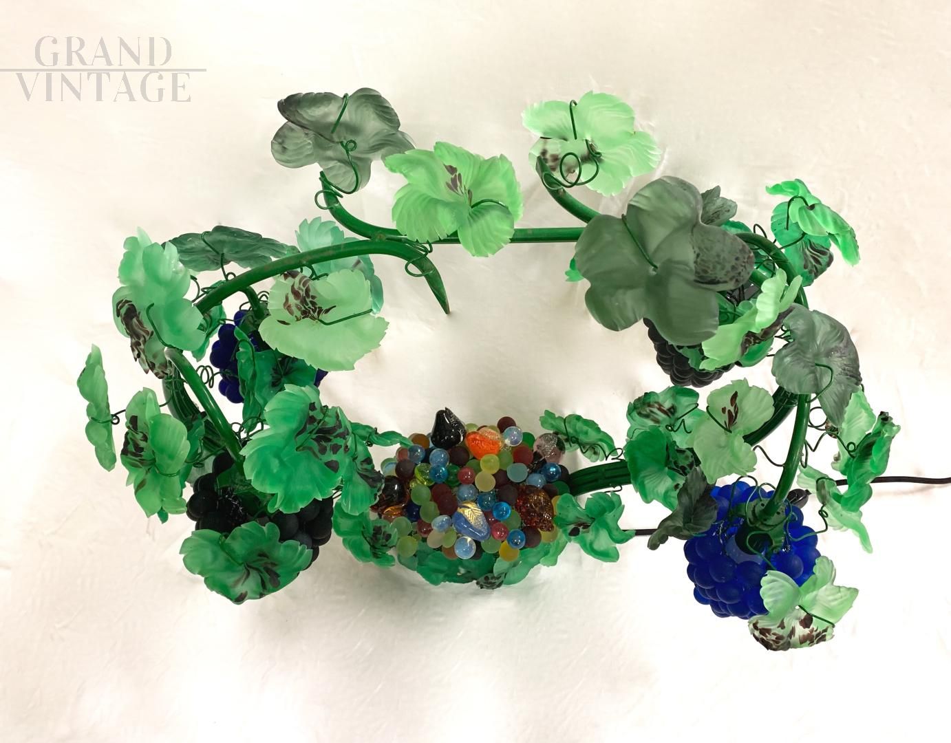 Lampada da tavolo design di Cesare Toso anni '70 in vetro di Murano con grappoli d'uva e foglie di vite, su struttura portante in ferro laccato verde. In buone condizioni. Disponibile la coppia, clicca qui per vederla! trattandosi di oggetti realizzati a mano non sono perfettamente uguali tra loro. La lampada ha un punto luce anche all'interno della base, ha complessivamente 4 punti luce per lampadine di tipo E14. una vera opera d'arte.