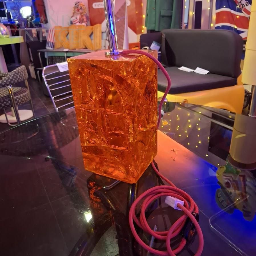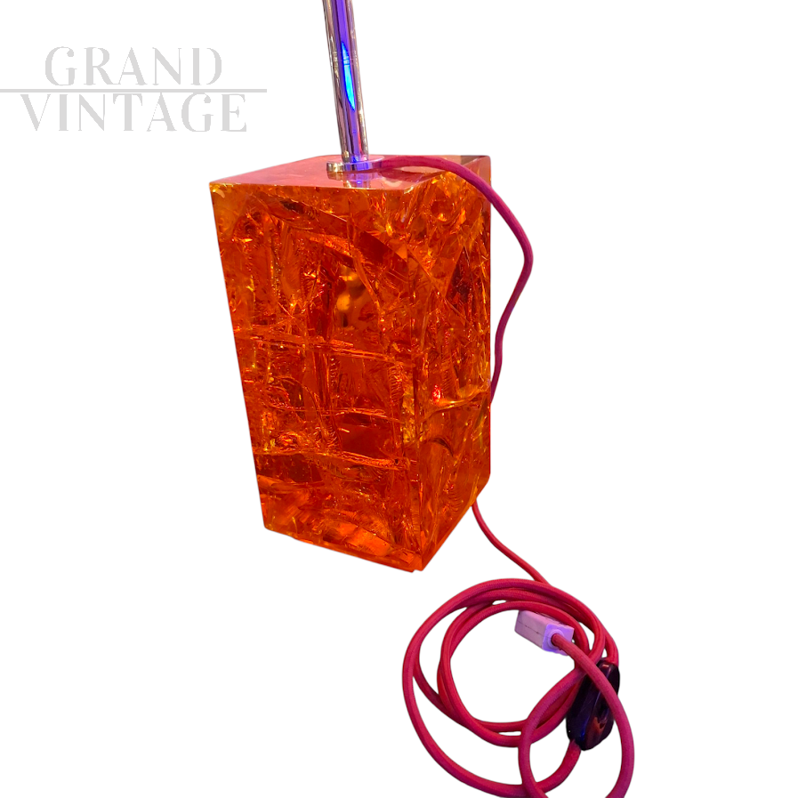 Bellissima lampada da tavolo di Marie-Claude de Fouquières in resina frattale con effetto ambra in colore arancione intenso - mattone, in ottime condizioni. La designer Marie-Claude de Fouquières (Francia, 1937) sperimentava le varie tecniche di lavorazione della resina colorata ottenendo diversi oggetti con diversi colori e lavorazioni.