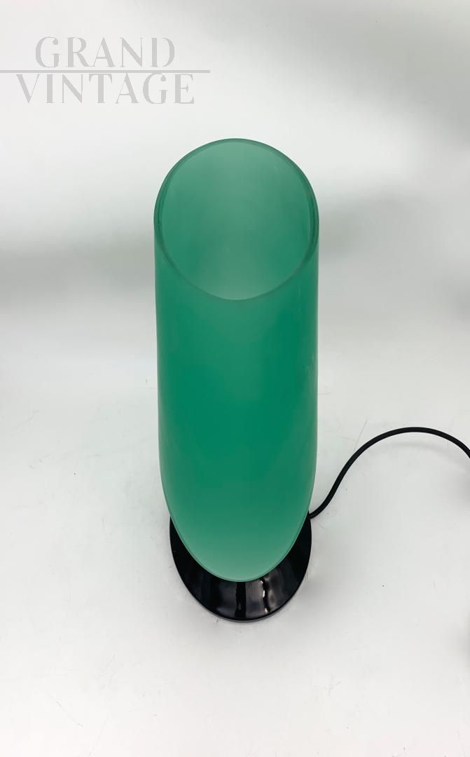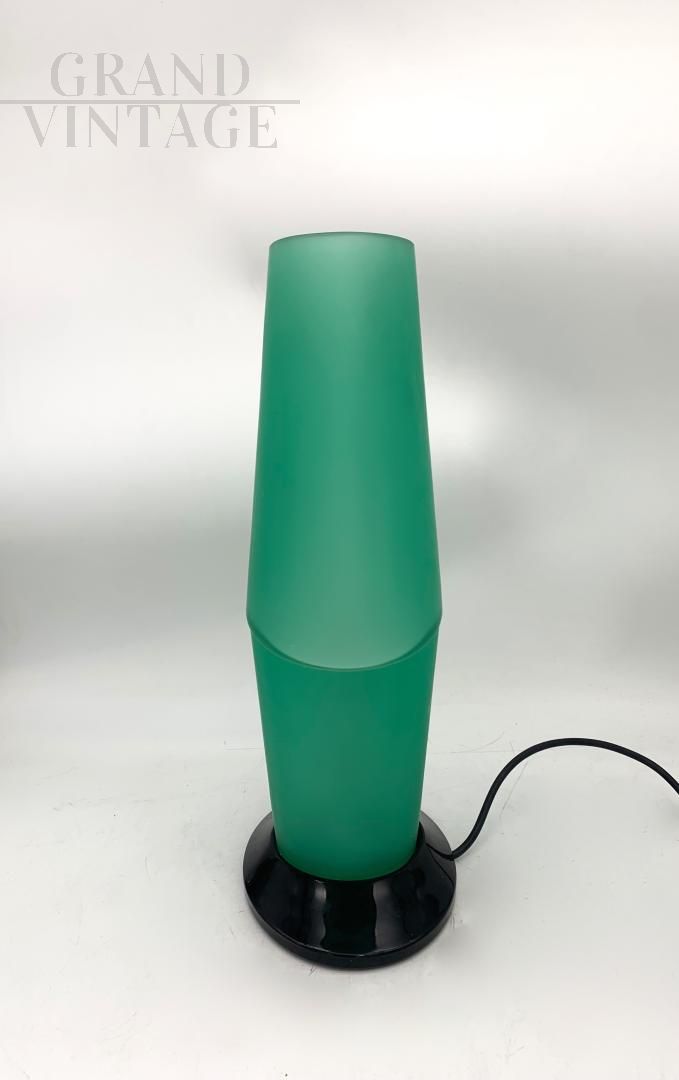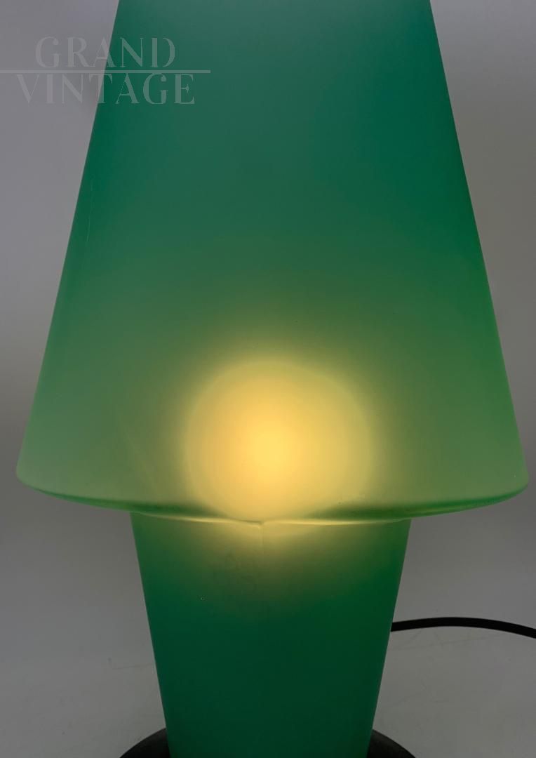 La lampada è realizzata in vetro di Murano. Ditta Mazzega modello "Egitto". Anno di realizzazione attorno agli anni 1995 Vetro color verde; lavorato a mano su stampo. La base è solida, in metallo color nero. Ha un portalampada E 27 e volendo si possono usare le lampadine al led. Potrebbe arredare delle scrivanie o vari mobili sia moderni che vintage. Impianto elettrico originale e funzionante. Fondo di magazzino.