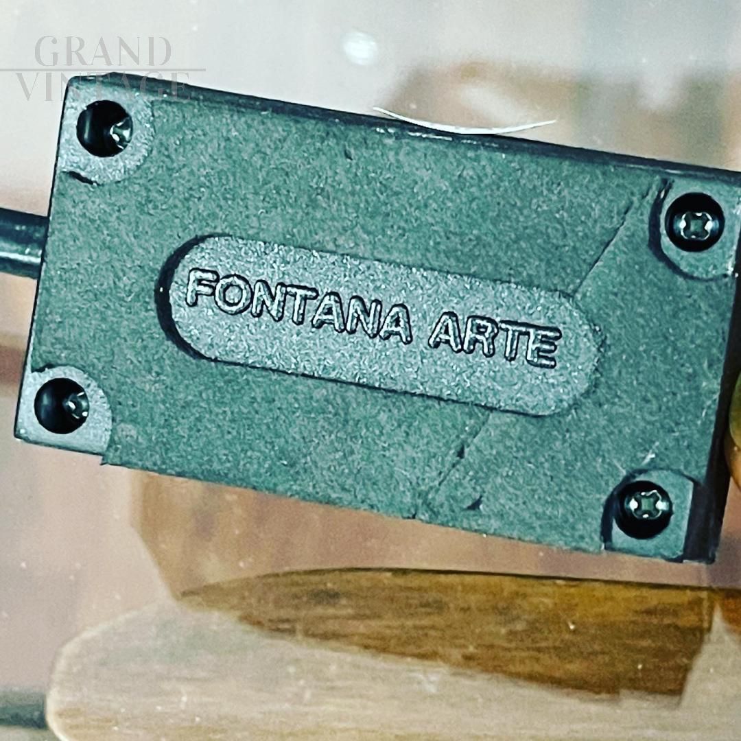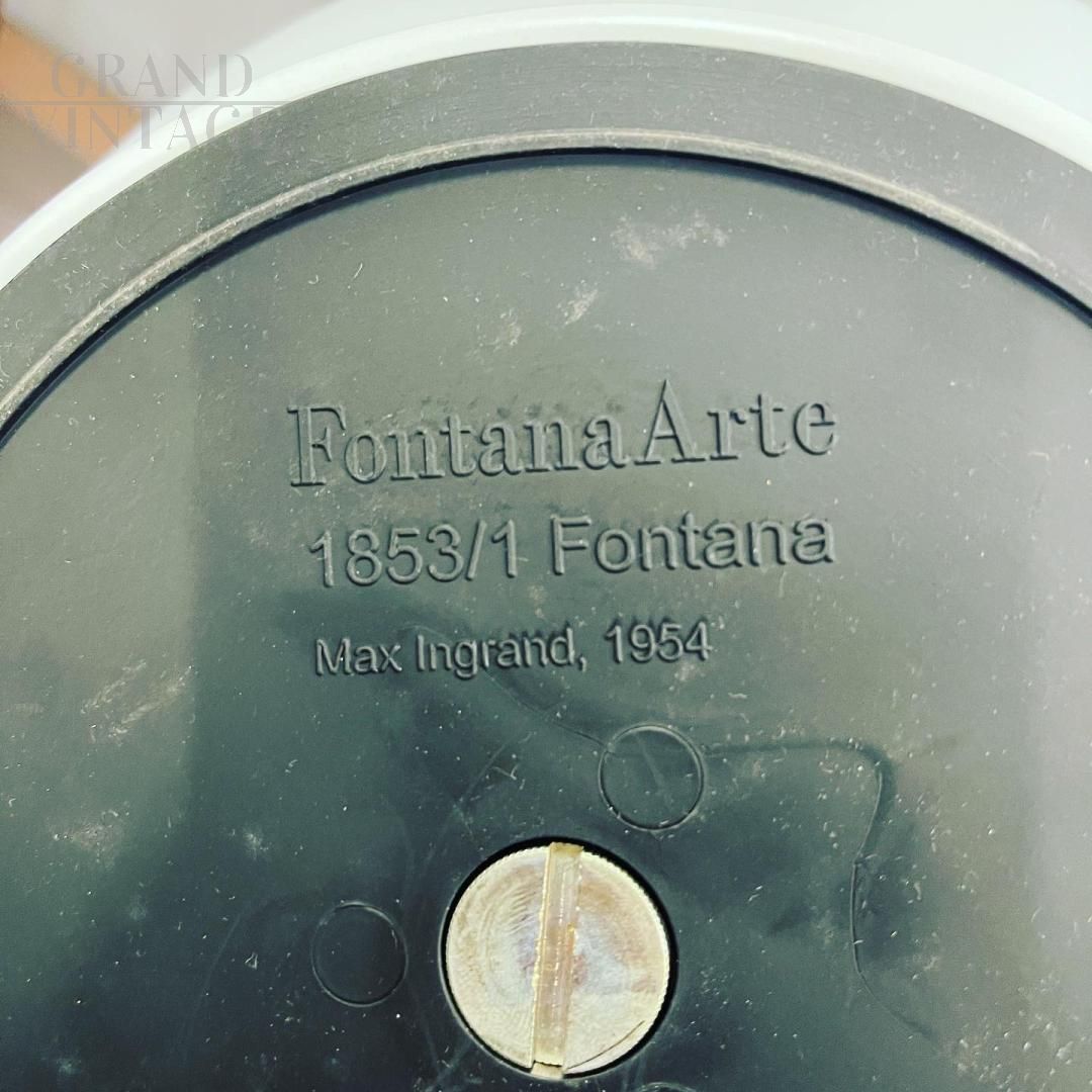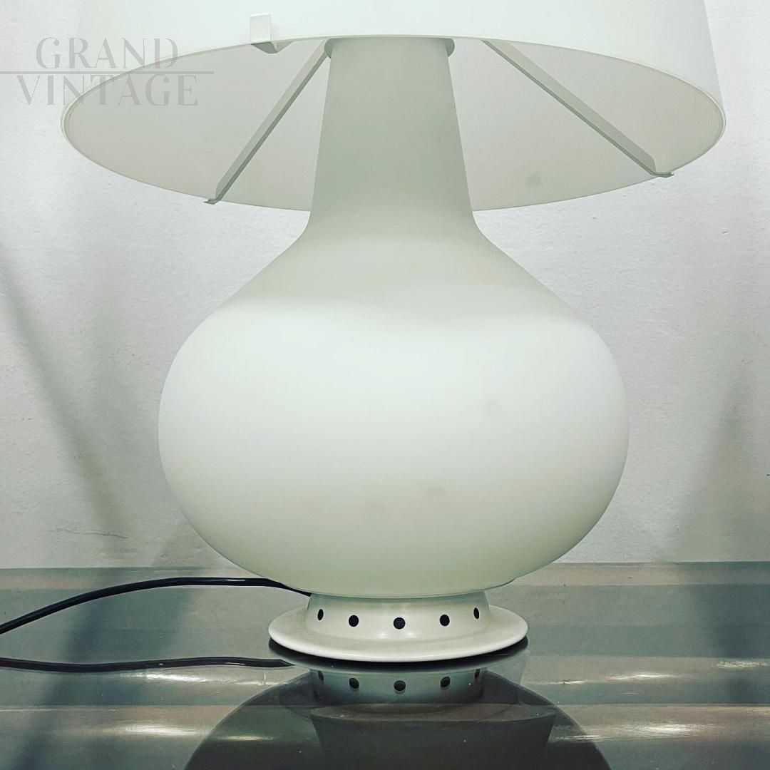 Lampada in vetro disegnata da Max Ingrand per Fontana arte, qui nella versione più grande di 80 cm di altezza. La struttura è in vetro opalino e poggia su una base in metallo verniciato bianco. Riporta il marchio sia sul fondo della base che sull'interruttore. Esemplare di recente produzione.