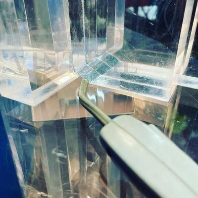 Grande lampada da tavolo di Sandro Petti per Maison Jansen in plexiglass Lucite, composta da elementi di forte spessore ad incastro che, scorrendo tra loro, danno accesso ad una grossa lampadina centrale.