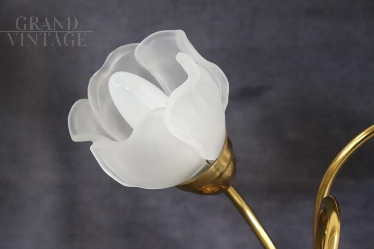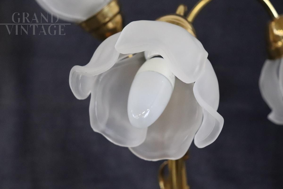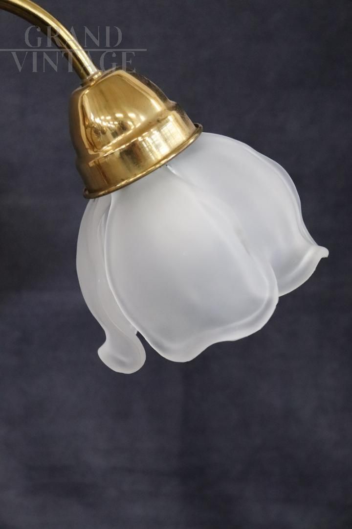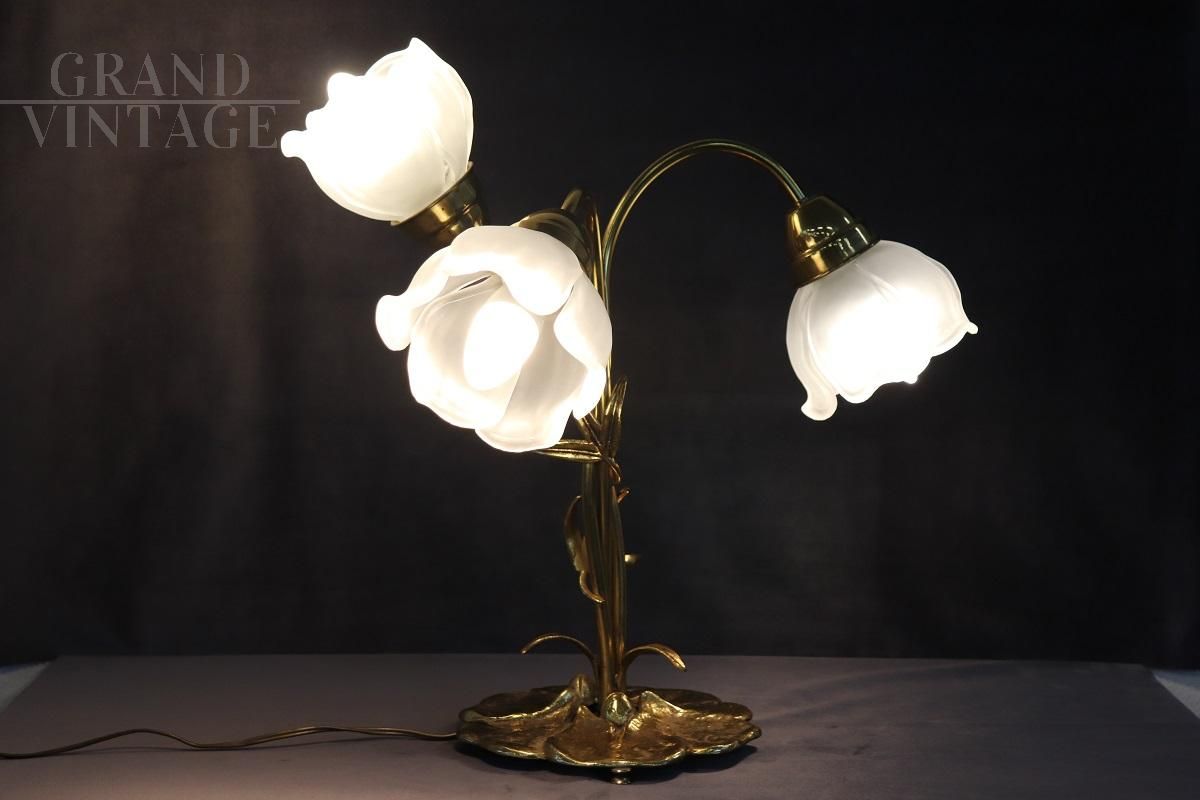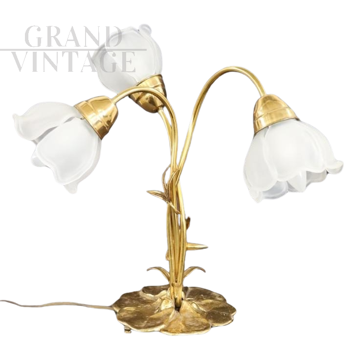 Bella lampada da tavolo in stile Art Nouveau Liberty realizzata negli anni '80 circa in raffinato ottone dorato, con tre punti luce con paralumi floreali a campanella in vetro bianco satinato. Perfettamente funzionante, in ottime condizioni. Prezzo trattabile.