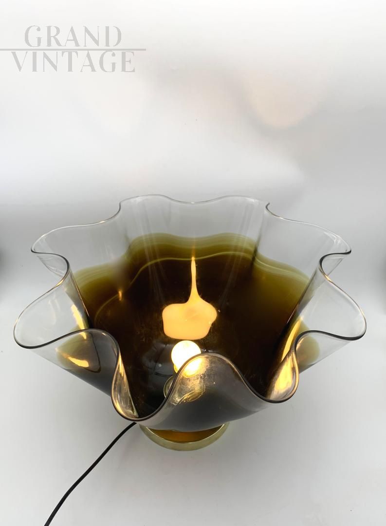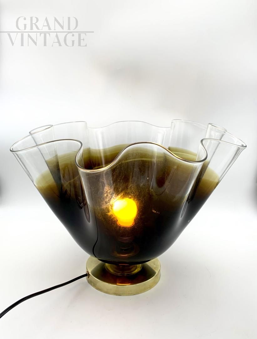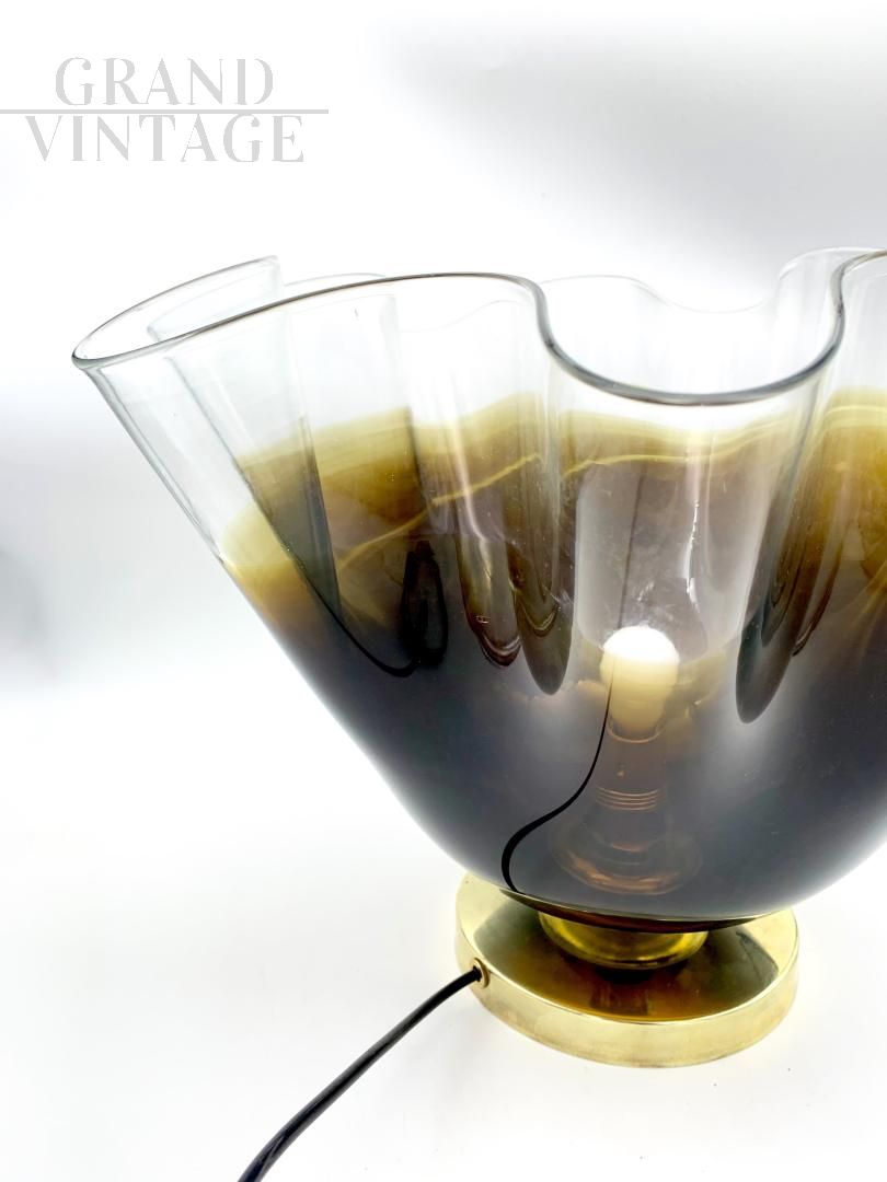 Lampada da tavolo in vetro di Murano marrone attribuita alla ditta Vistosi, anni '60. La lampada ha una forma a fazzoletto in vetro soffiato con sfumature del marrone e dell'ocra, e poggia su una base in ottone. La lampada è in buone condizioni, funzionante e pronta all'uso con impianto elettrico a norma che supporta lampadine E27, ed è adatto anche poer le lampadine a LED. L'oggetto è ideale da inserire in ambienti eleganti e raffinati, o anche in ambienti rustici o arredamenti moderni.