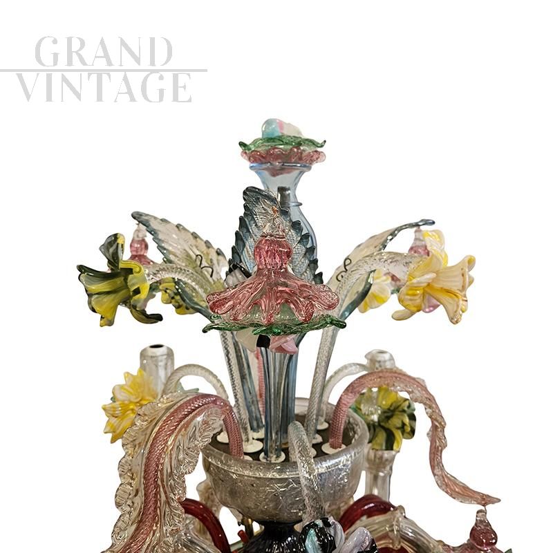 Grande e magnifica lampada da tavolo artistica in vetro di Murano multicolore con fiori e foglie, poggiante su 4 gambe e composto da 6 punti luce.