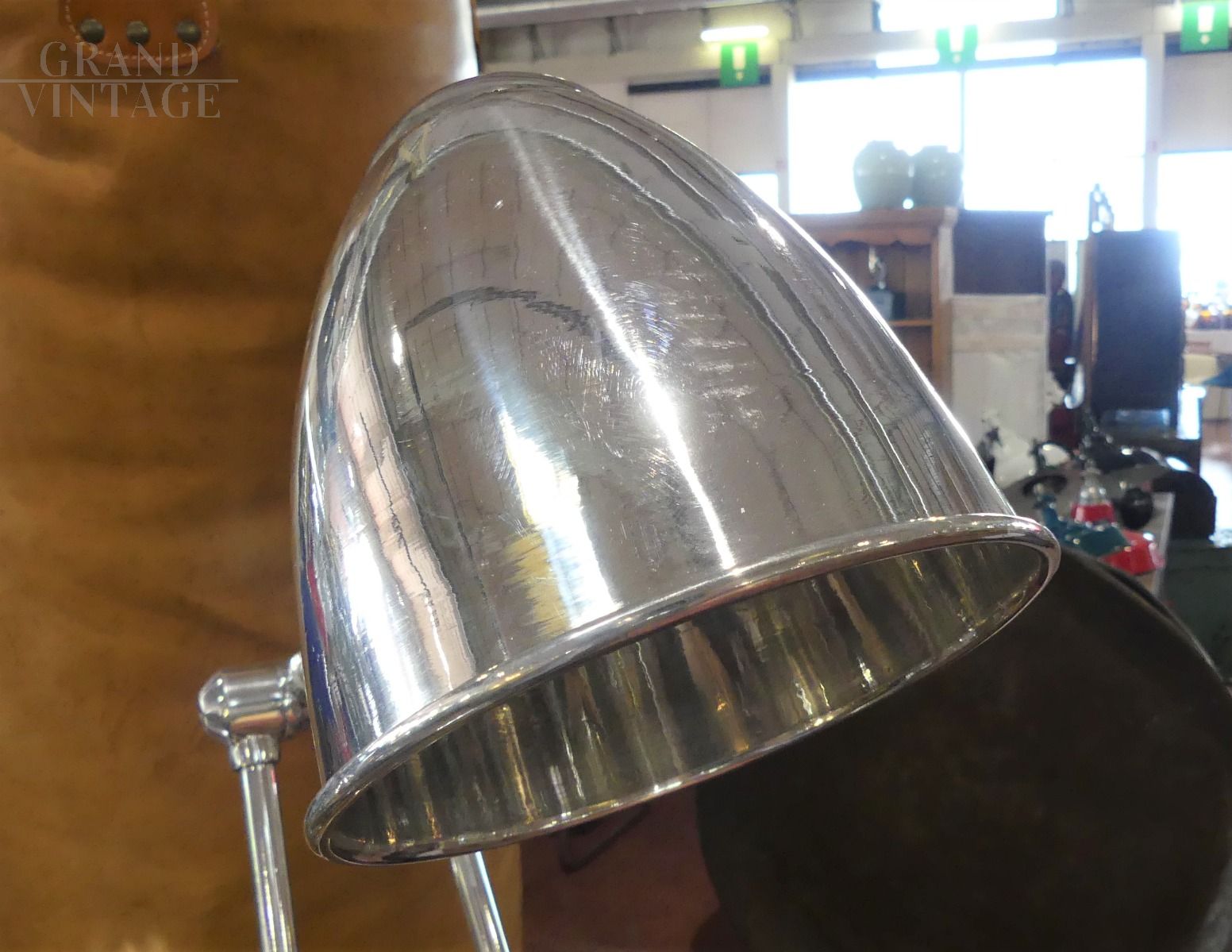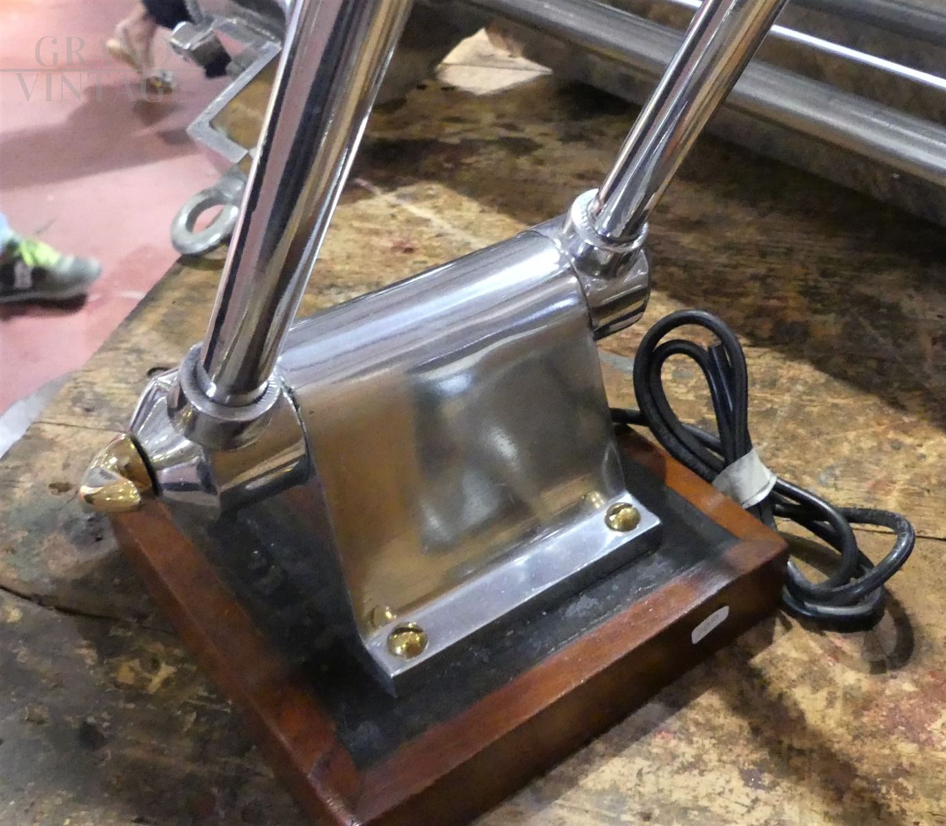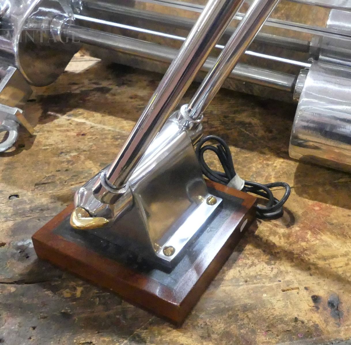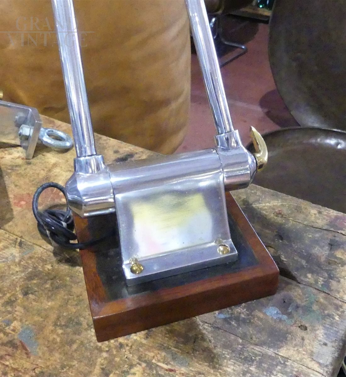 Lampada da tavolo industriale, si tratta di una lampada da parete per tavolo da carteggiatore riadattata a lampada da tavolo. La lampada è in metallo cromato e poggia su una base in legno, un tocco di eleganza è dato dalle viti e levette per la regolazione in color oro.