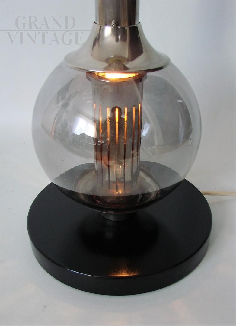 Lampada da tavolo modernista anni '70 Realizzata in acciaio nichelato e vetro fumé. La lampada necessita di 2 lampadine E14.
