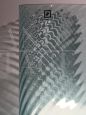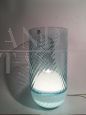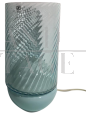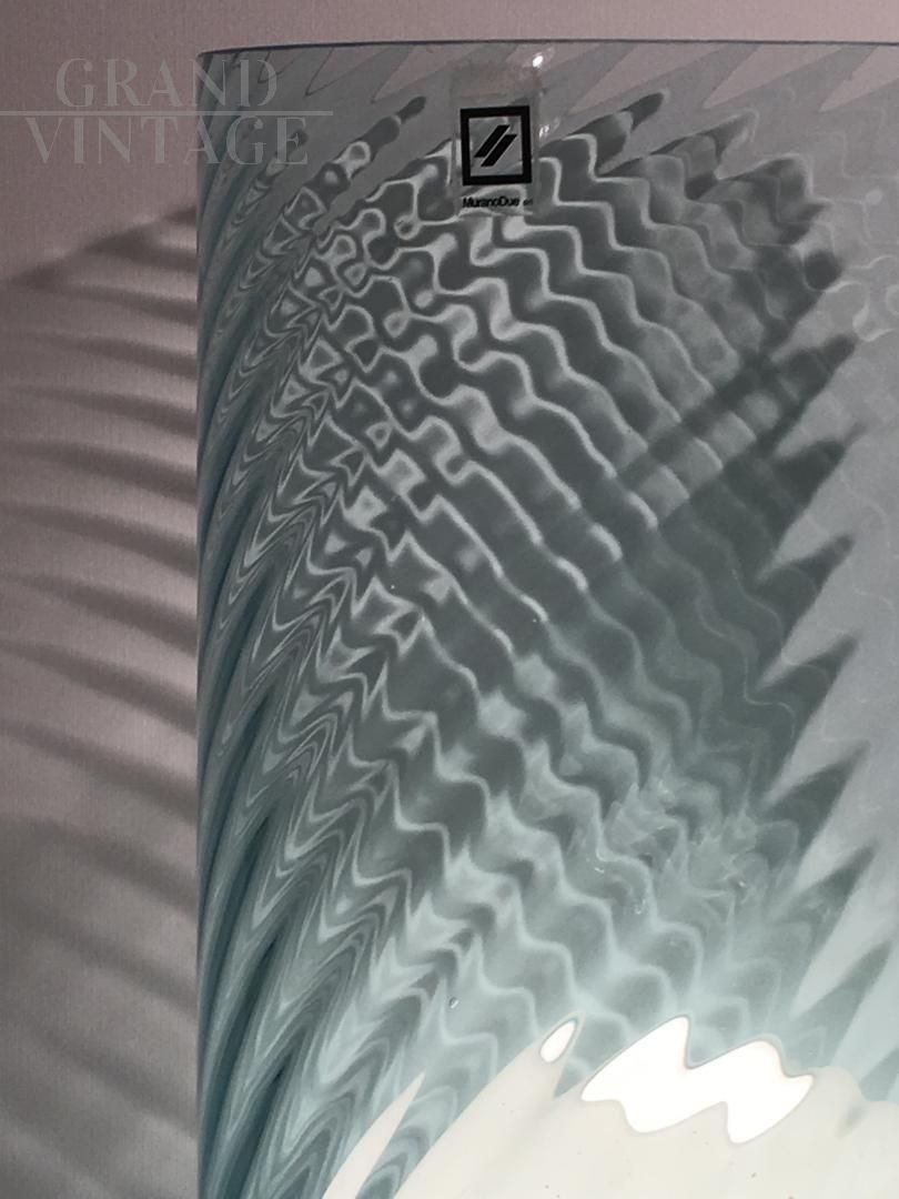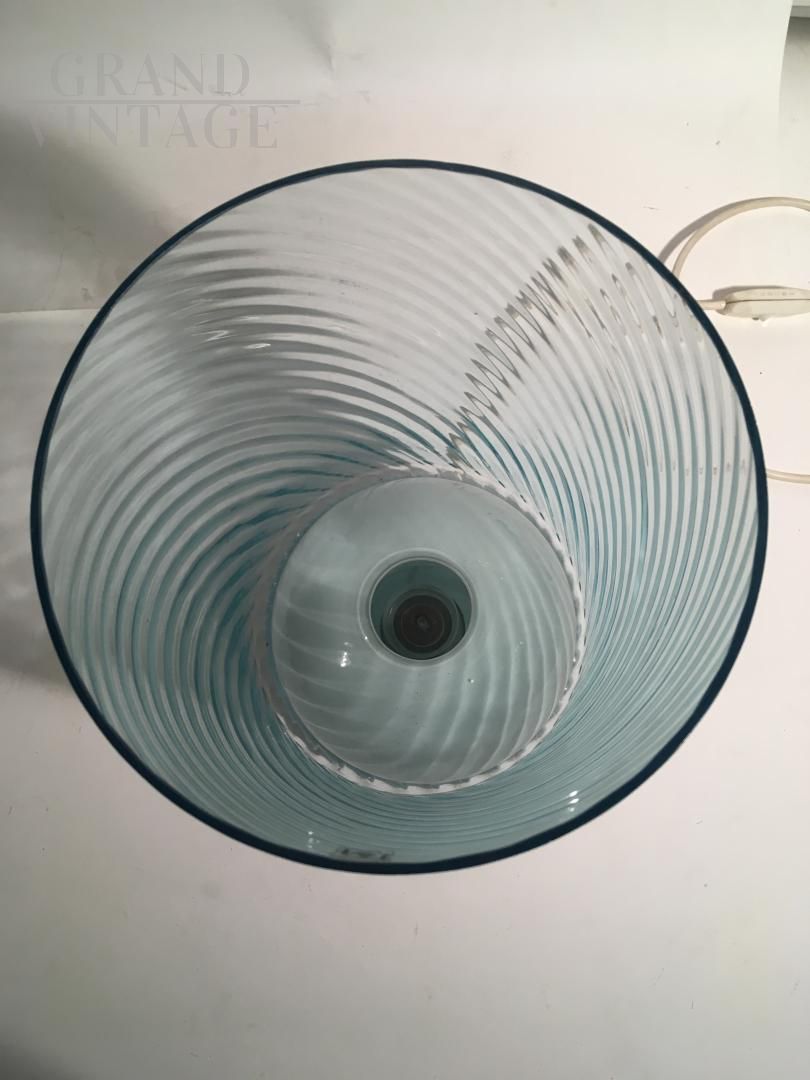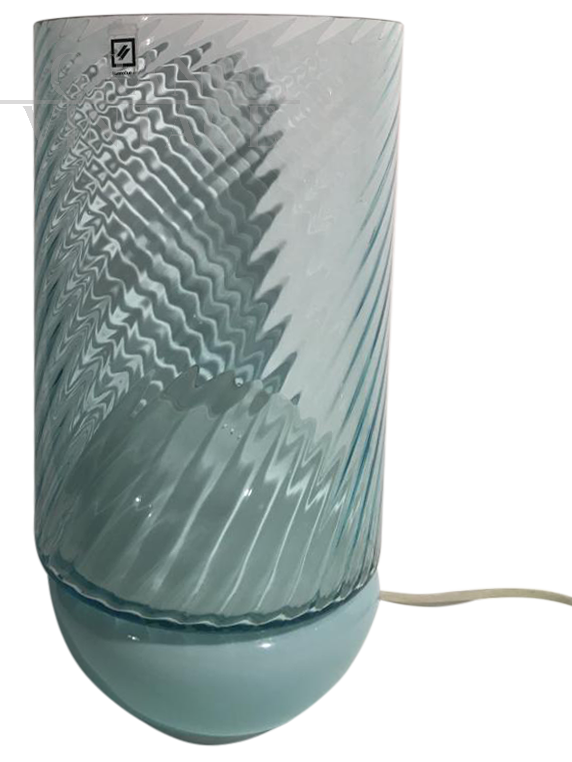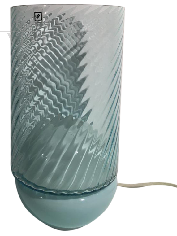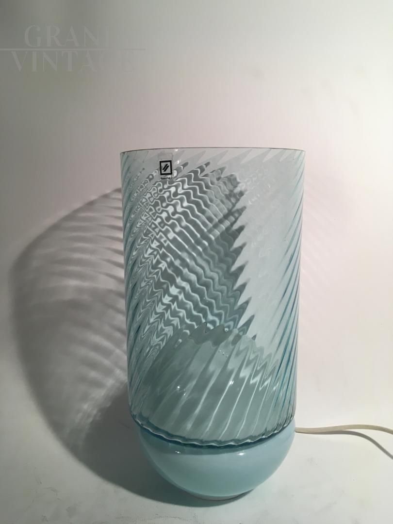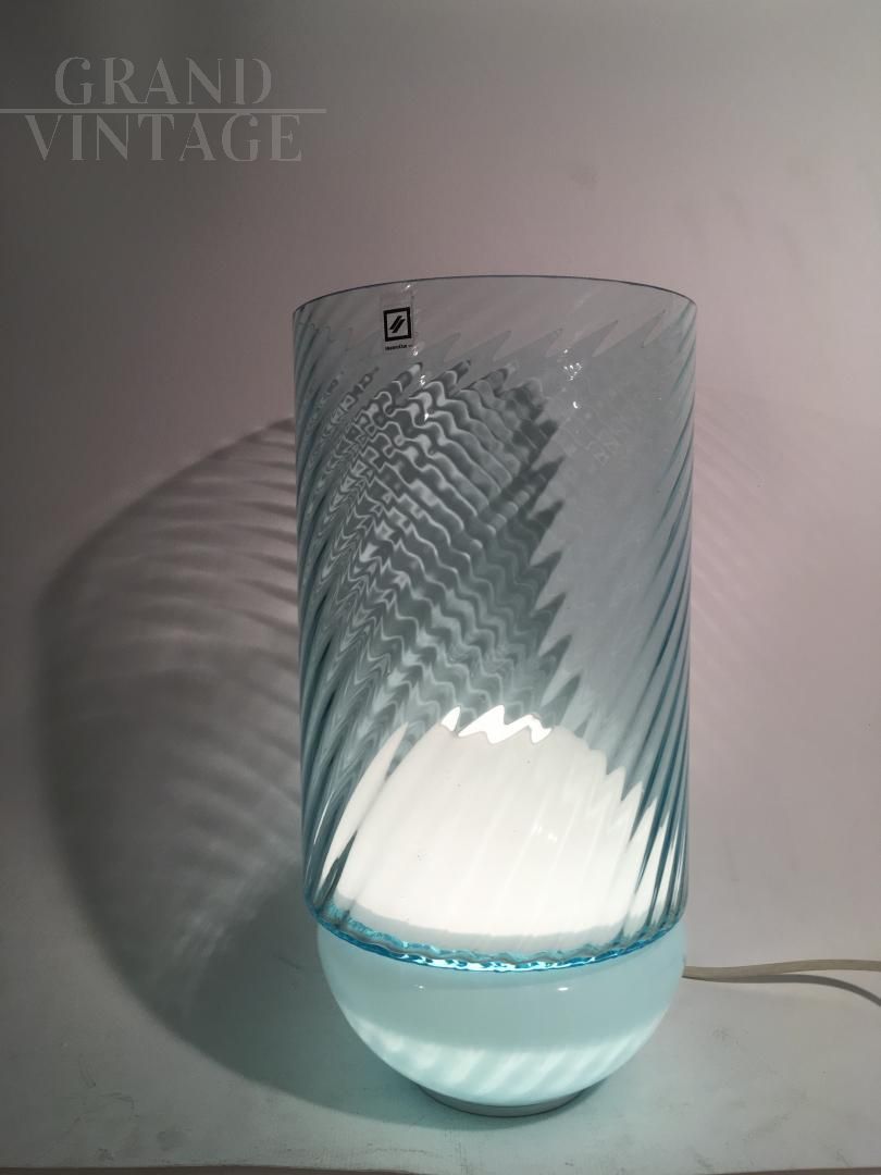 Lampada da tavolo della ditta MuranoDue di Murano, bellissimo esemplare con un vetro trasparente color azzurro. Il vetro è delicato, con una bella lavorazione. La parte più bassa è una cupola di vetro di colore bianco lattimo, che appoggia sulla base azzurra. Lampada molto particolare, cilindrica, con bollino MuranoDue. Portalampada E14, la lampada non è mai stata modificata.