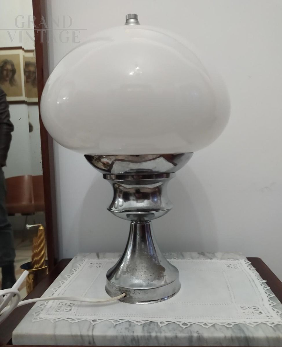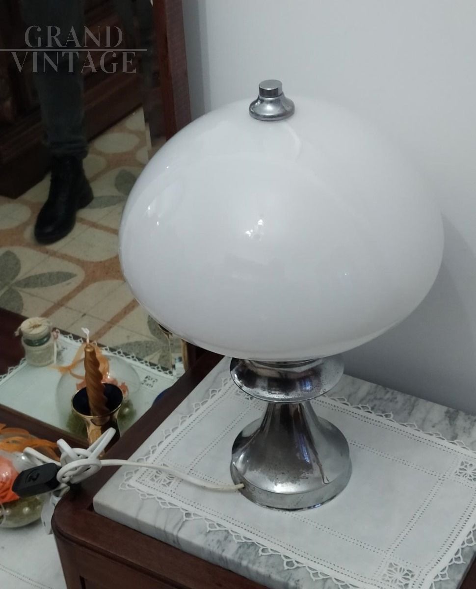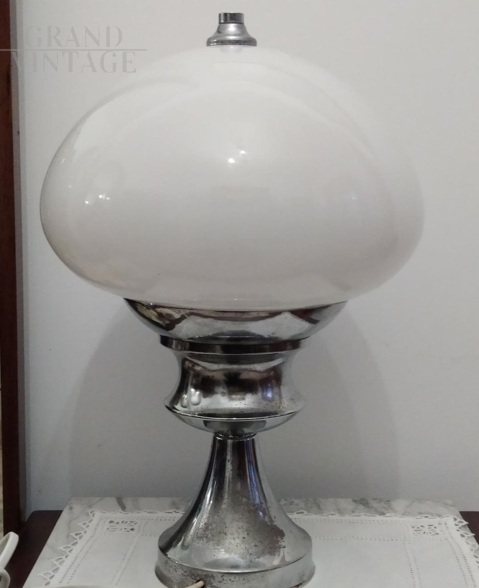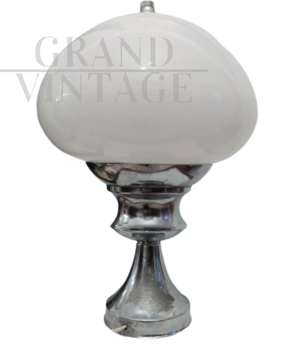 Lampada da tavolo vintage anni '60 con struttura in acciaio e paralume in vetro di Murano bianco. Altezza 38 cm, diametro 27 cm.