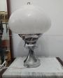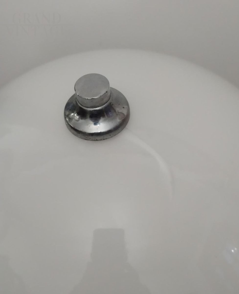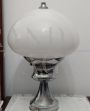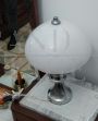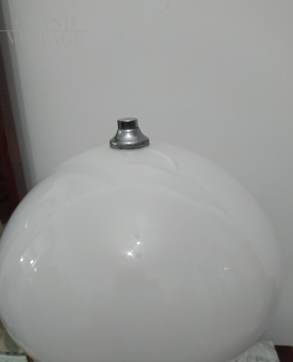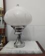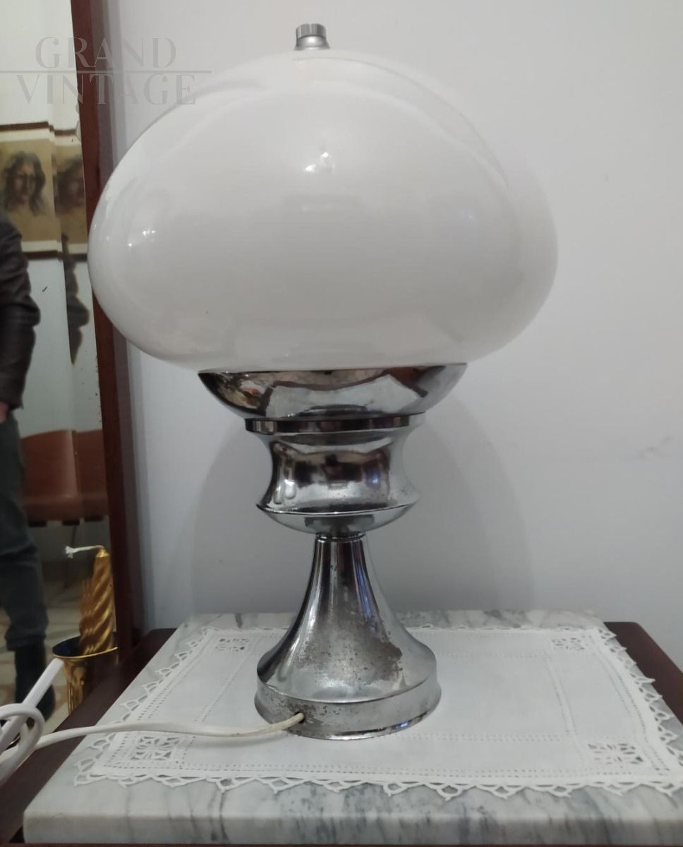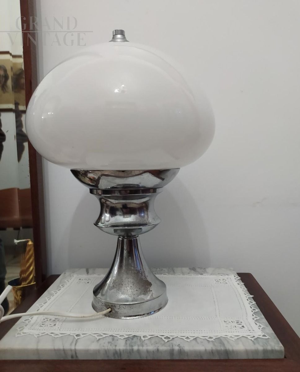 Lampada da tavolo vintage anni '60 con struttura in acciaio e paralume in vetro di Murano bianco. Altezza 38 cm, diametro 27 cm.