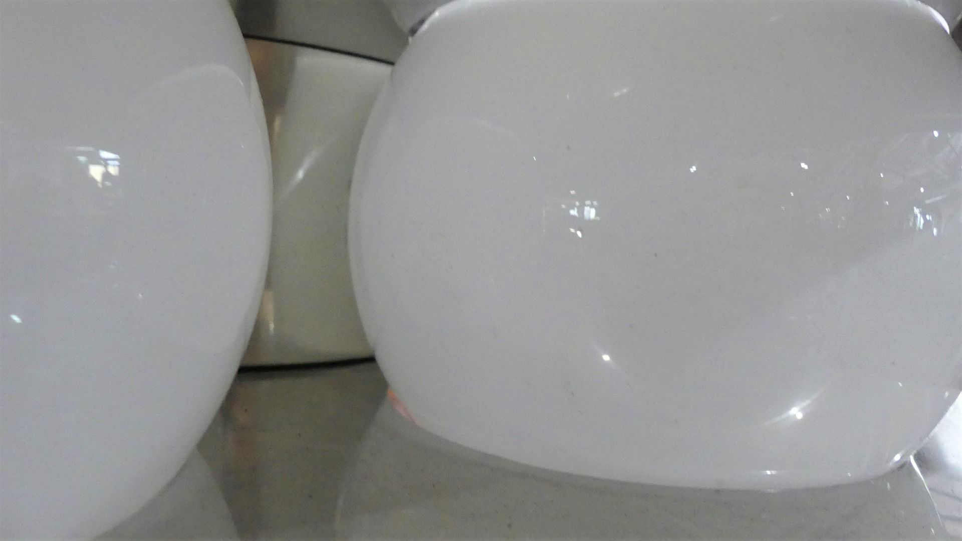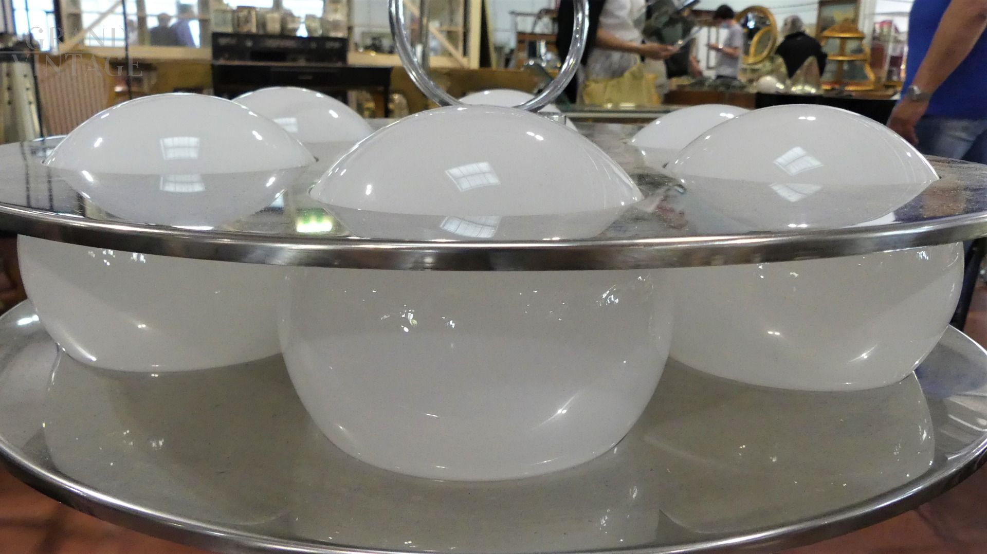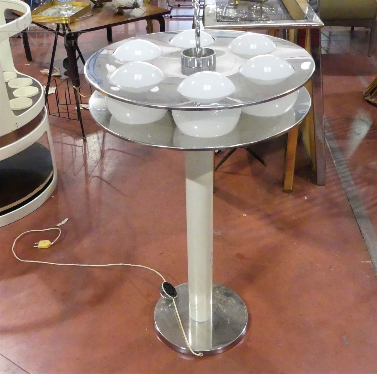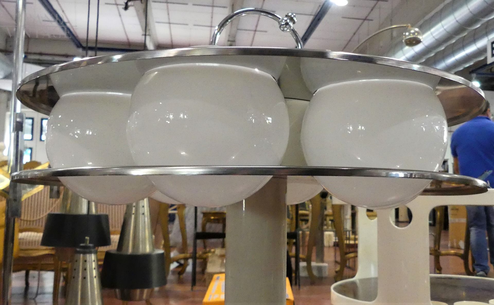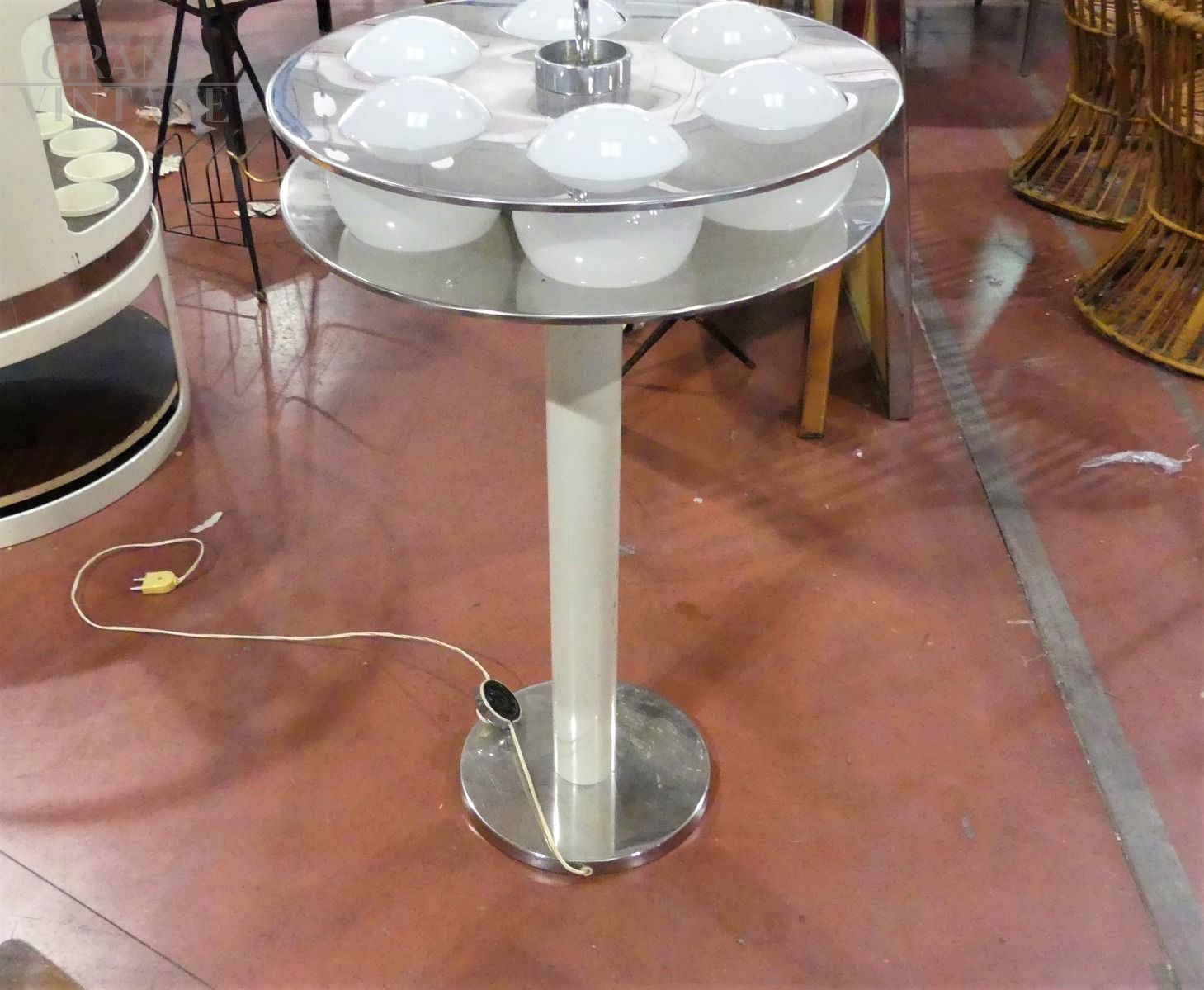 Bellissima lampada da terra stile space age attribuita a Guzzini, con base in acciaio e stelo laccato bianco, sei sfere luminose che emergono da due dischi di acciaio al piano. Un vero tocco di design.