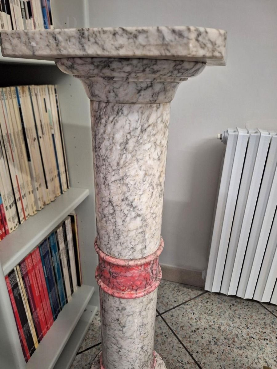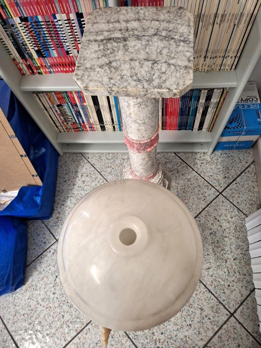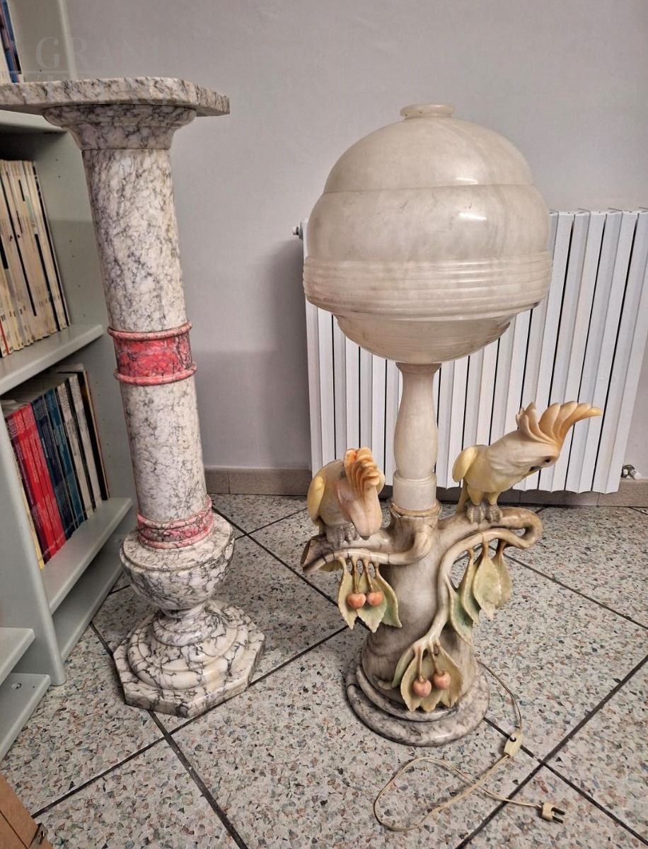 Lampada da terra piantana art déco in alabastro con scultura di pappagalli cacatua, divisibile in una colonna portante e la lampada vera e propria da poggiare sulla colonna stessa. Elemento decorativo di enorme valore art déco, era in una famosa villa di Foggia negli anni '50-'60. Nella sfera c'è un attacco per una lampadina ma i collegamenti elettrici sono da mettere a posto. Altezza totale circa 130-140 cm.