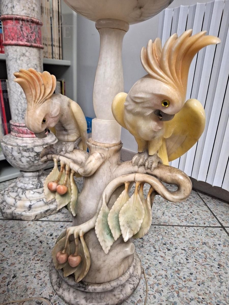 Lampada da terra art déco in alabastro scolpito con pappagalli