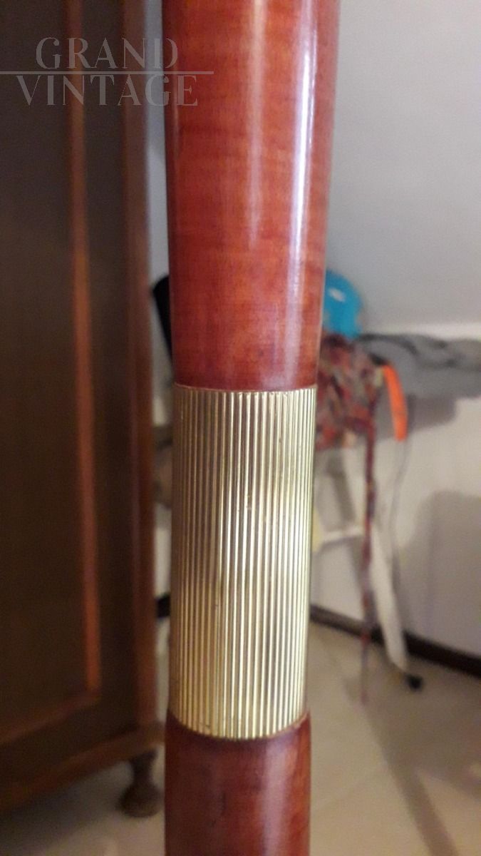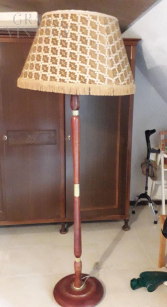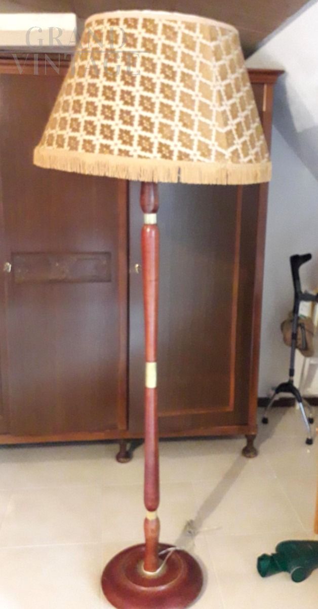 Lampada da terra piantana vintage in legno di noce liscio, con paralume in stoffa damascata oro con frange e inserti di metallo dorato zigrinato nel legno.