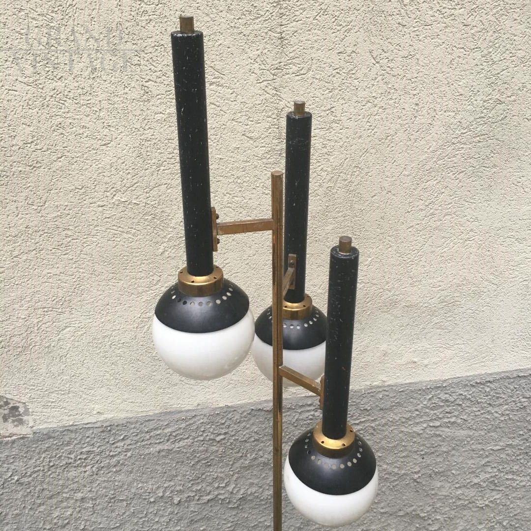 Questa lampada da terra vintage, in metallo verniciato, ottone e 3 piccoli globi di vetro è nel tipico stile italiano di metà del secolo. Base tonda in marmo, interruttore a pedale.