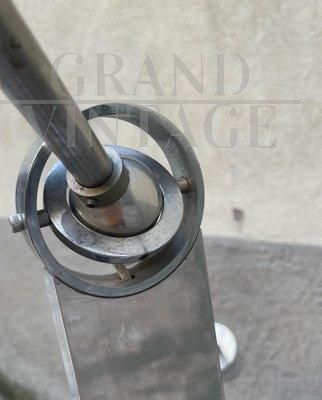 Questa lampada, di cui non conosciamo il designer, è stata realizzata su un disegno tecnico focalizzato su un importante snodo sferico libero, senza fermi. È sufficiente muovere il braccio in equilibrio stabile grazie al contrappeso, e la lampada resterà in posizione, senza dover bloccare il fulcro.