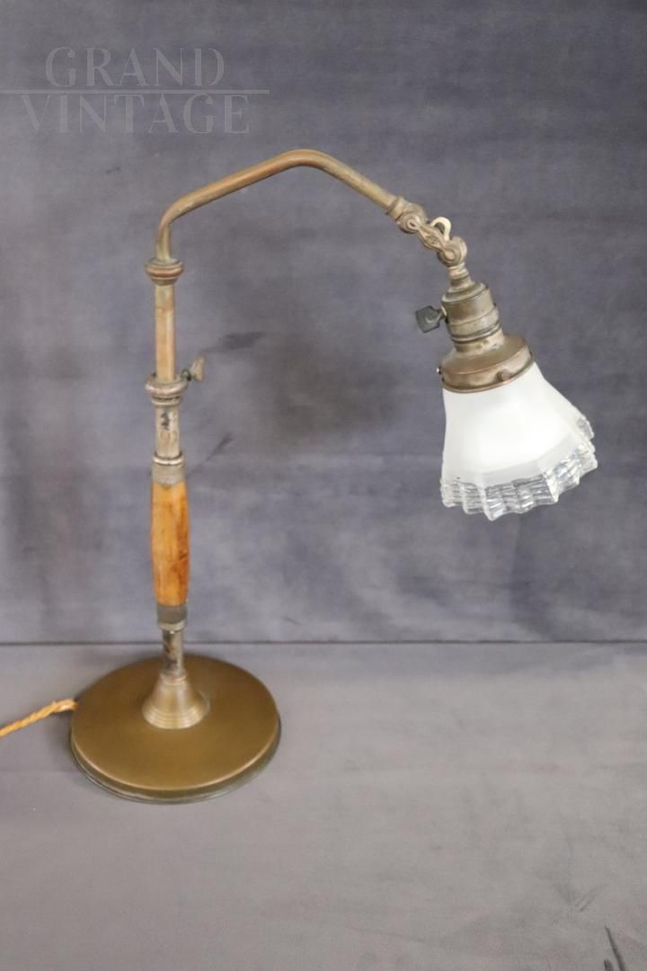 Bella lampada da tavolo liberty italiana in ottone e legno di faggio con paralume direzionabile a fiore in vetro satinato bianco, databile nei primi anni del Novecento, anni ’30 circa. Dotata di una luce e perfettamente funzionante, la lampada è regolabile in altezza e nella direzione della luce. Patina dovuta al trascorrere del tempo visibile nell’ottone. La lampada è marchiata “A. Perazzone Torino", storica azienda produttrice di lampade del Nord Italia. Prezzo trattabile.