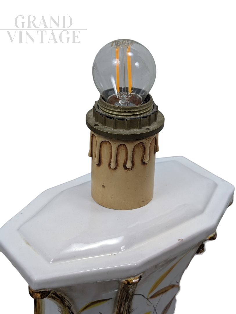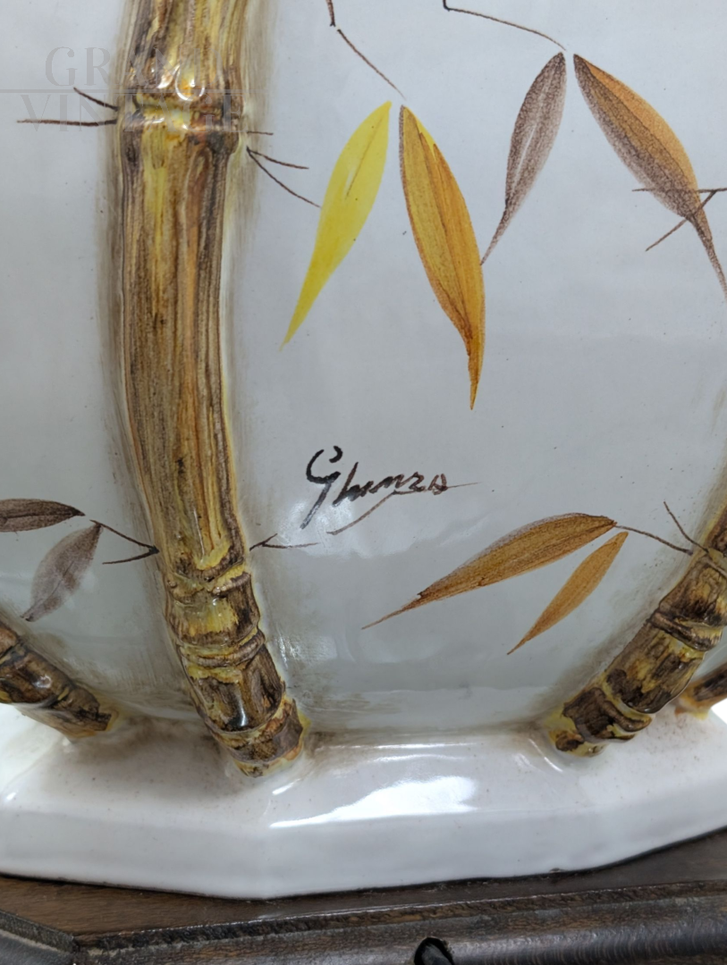 Lampada da tavolo in ceramica decorata a mano con motivo di bambù e foglie stilizzate. La base della lampada ha una forma bombata a bulbo, suddivisa da rilievi che imitano canne di bambù, accentuando l’effetto tridimensionale e naturale del design. Il corpo ceramico è smaltato in bianco lucido, decorato con foglie in tonalità autunnali – giallo, marrone e ocra – dipinte con cura artigianale. Firmata "Ghinza" sul corpo della lampada, testimonianza del lavoro manuale dell’artista. La lampada poggia su una base esagonale in legno scuro e presenta un portalampada in stile classico con effetto "colata" dorata. Viene fornita con una lampadina decorativa a filamento LED, che ne esalta l’eleganza anche da accesa.