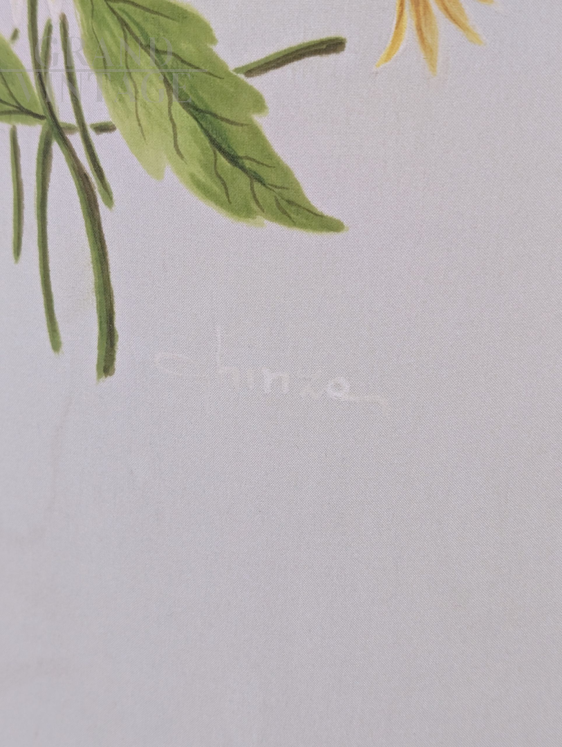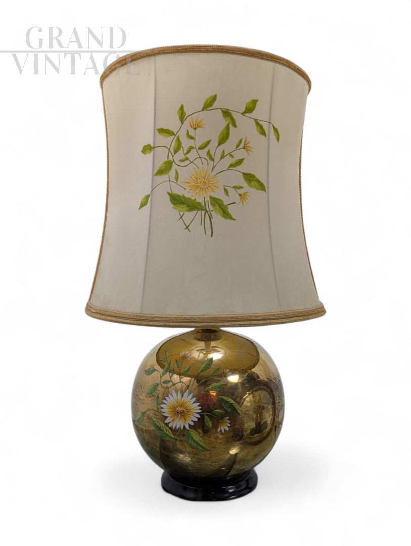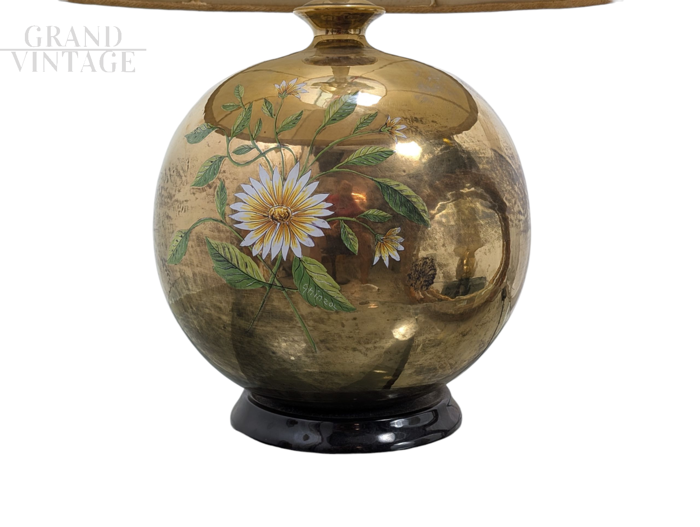 Questa elegante lampada da tavolo unisce l'artigianato artistico a uno stile vintage raffinato. La base della lampada è sferica, in ceramica dorata specchiata con finitura lucida e riflettente. Su di essa è dipinto a mano un delicato motivo floreale che raffigura margherite bianche con dettagli gialli e foglie verdi, aggiungendo un tocco naturale e romantico al design. Il paralume in tessuto chiaro ha una forma leggermente svasata e presenta anch’esso una decorazione floreale coordinata, dipinta a mano. Al centro spicca una grande margherita gialla circondata da foglie verdi e boccioli, con la firma "Ghinza" visibile sotto il decoro, indice di lavorazione artistica e autenticità.