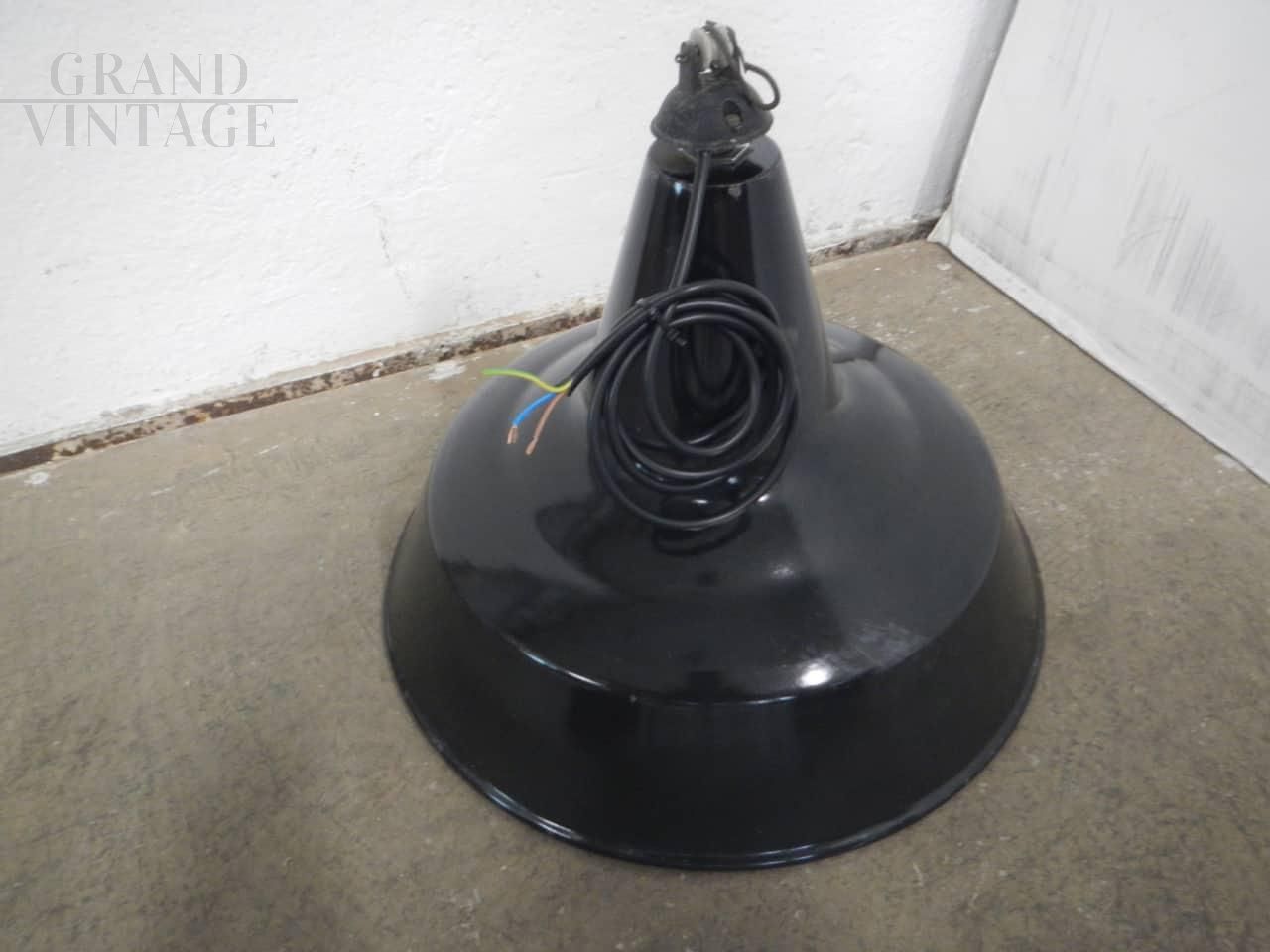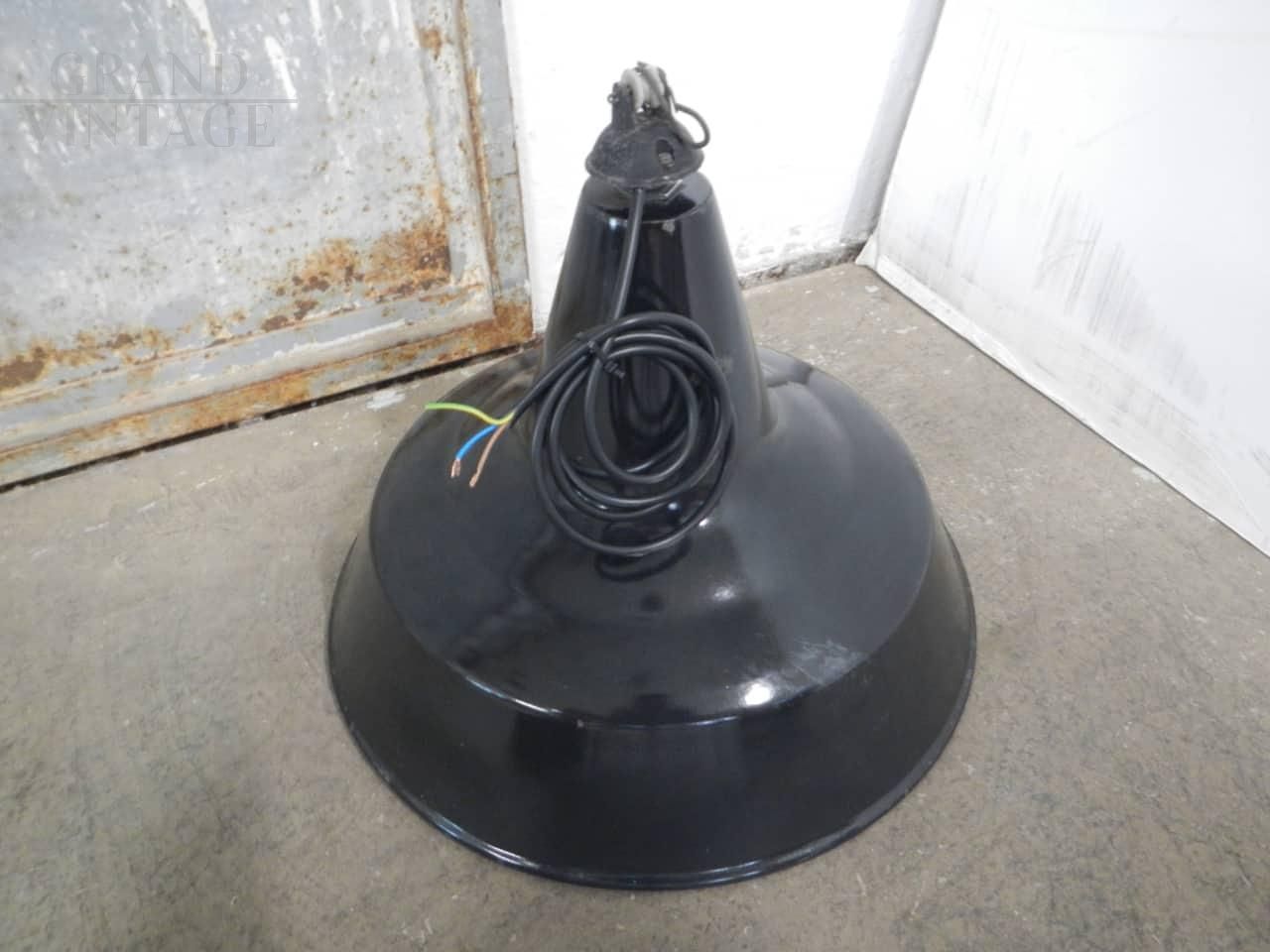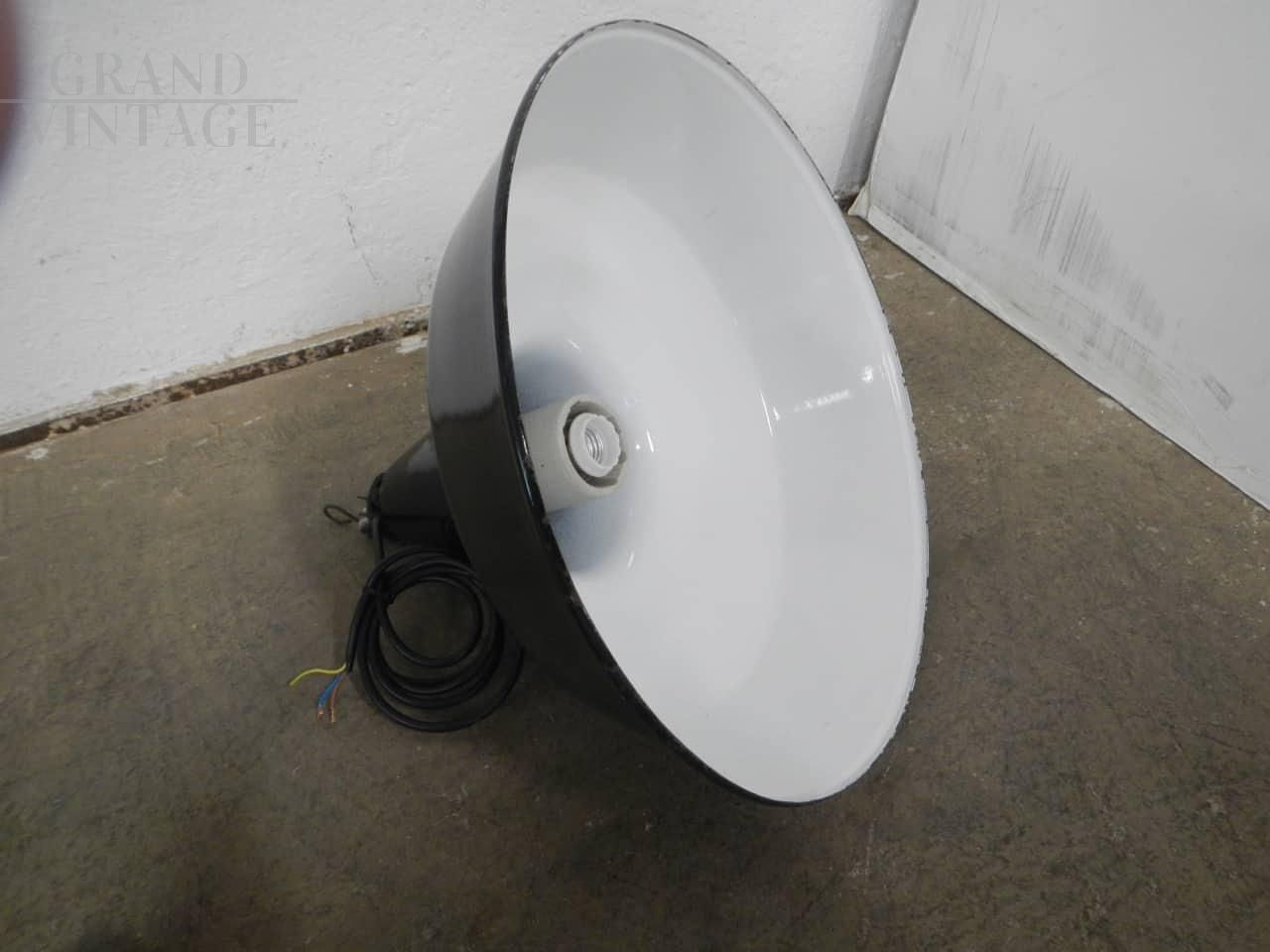 Lampada industriale vintage in metallo nero con interno bianco e gancio in ceramica, impianto elettrico funzionante con attacco lampadina E27. In buone condizioni, presenta i naturali segni del tempo che ne accrescono il fascino.