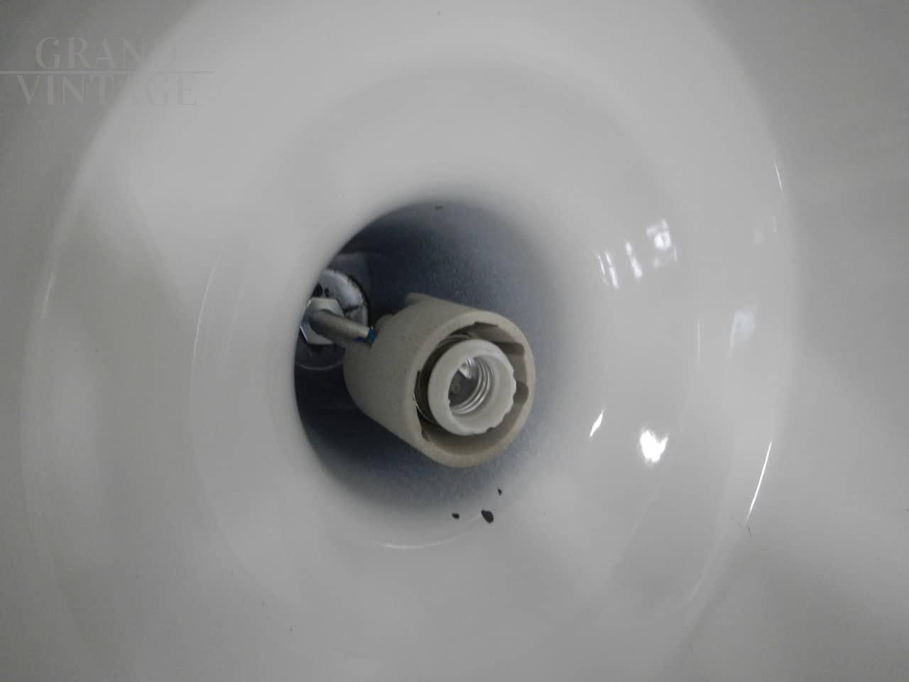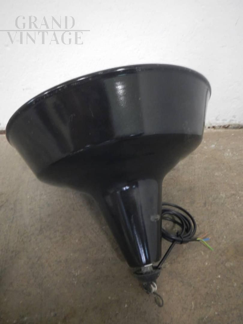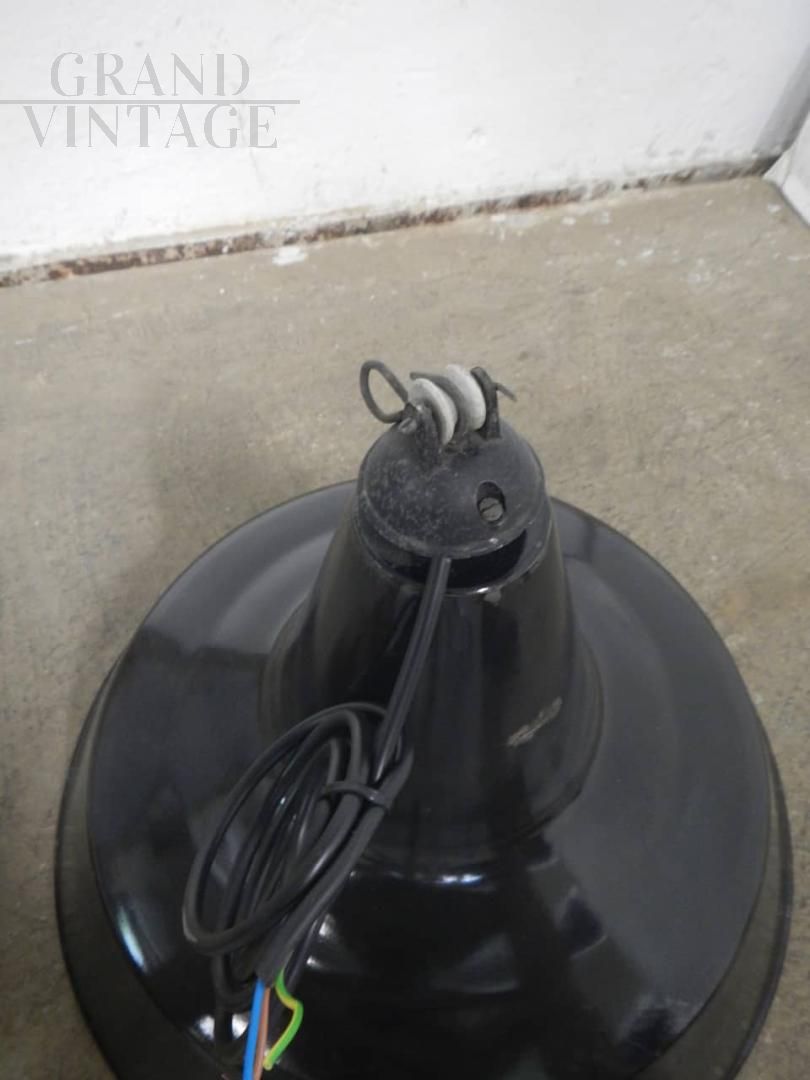Lampada industriale vintage in metallo nero con interno bianco e gancio in ceramica, impianto elettrico funzionante con attacco lampadina E27. In buone condizioni, presenta i naturali segni del tempo che ne accrescono il fascino.