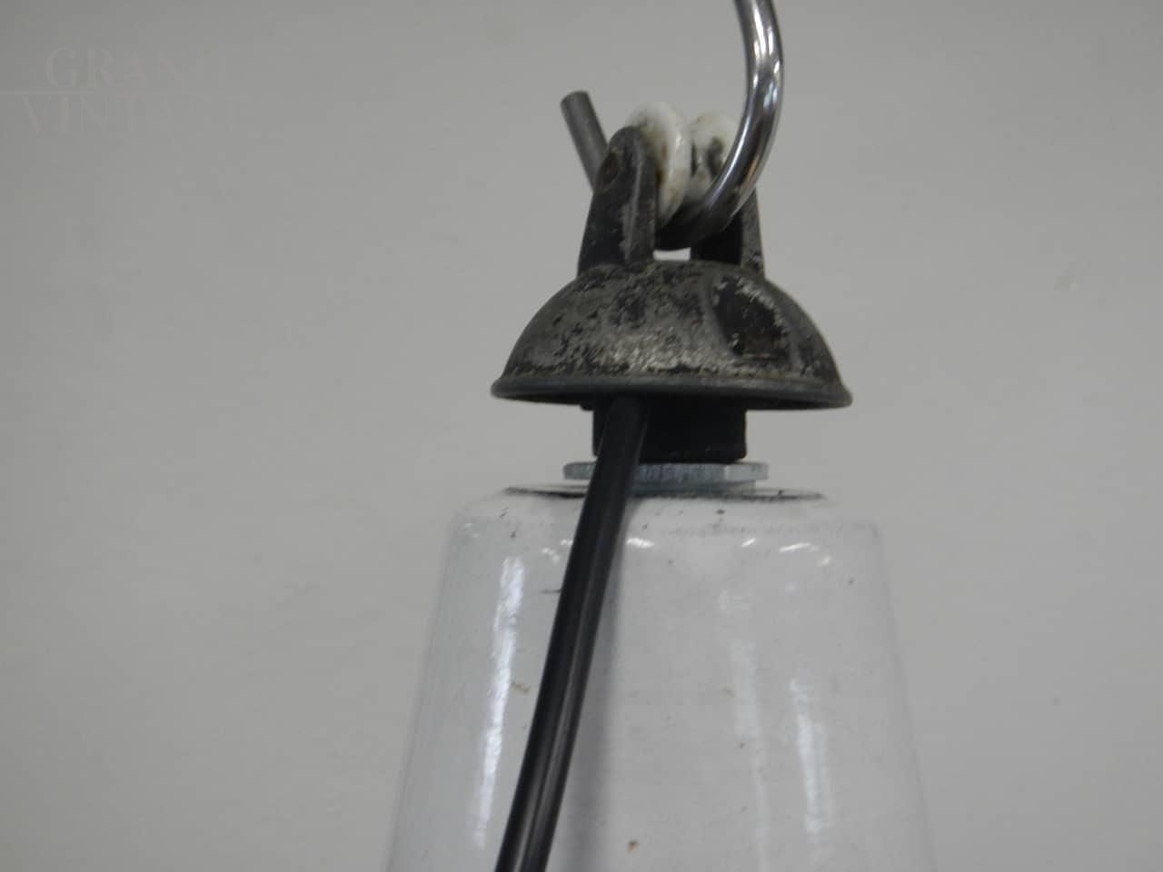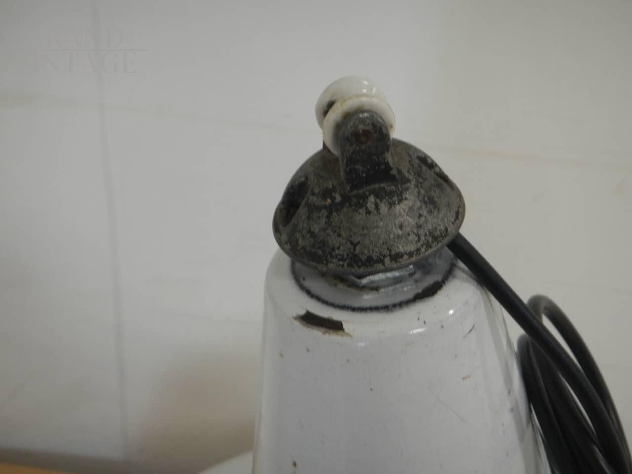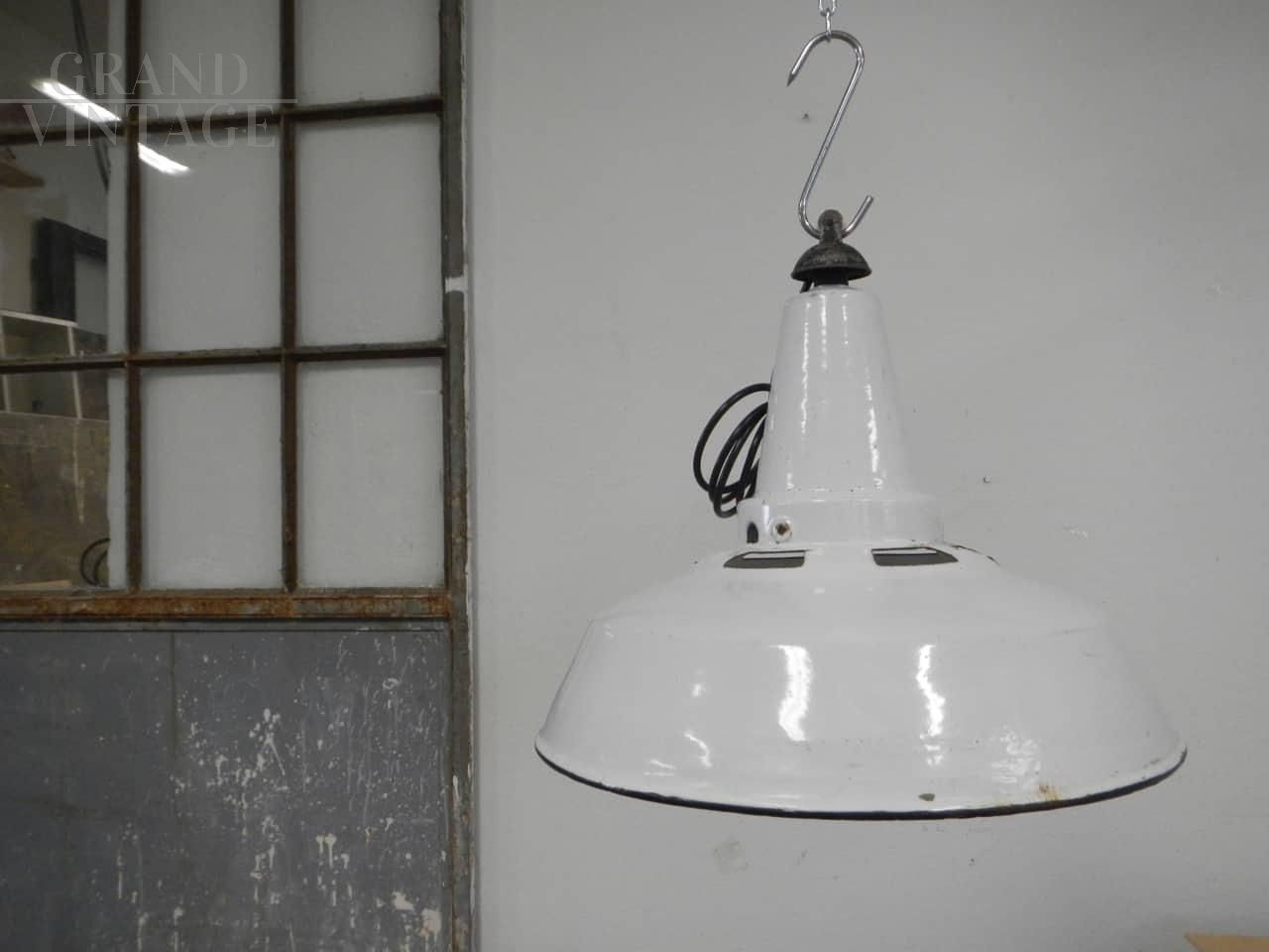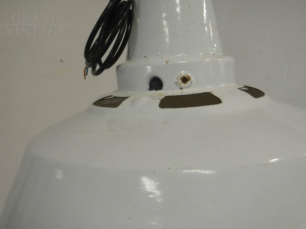 Lampada industriale a sospensione a imbuto in metallo bianco panna con interno bianco, con diametro 45 cm, anni '50, impianto elettrico rifatto e funzionante con attacco per lampadina E27. In buone condizioni con evidenti segni dell'uso, come da foto.