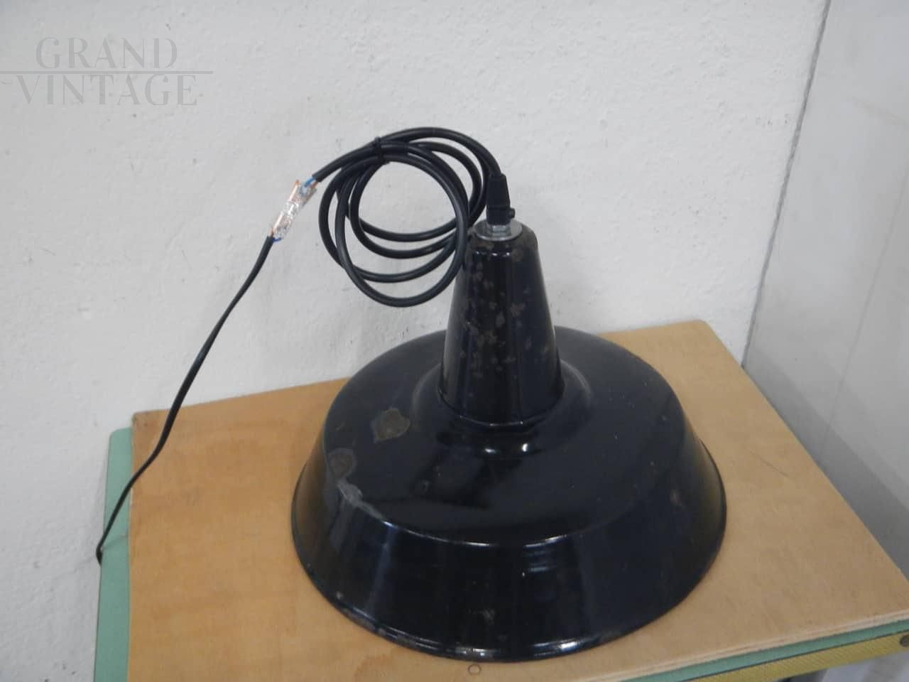 Lampada industriale in metallo nero a imbuto, diametro 30 cm, 1950