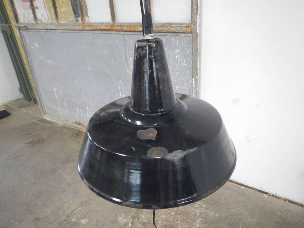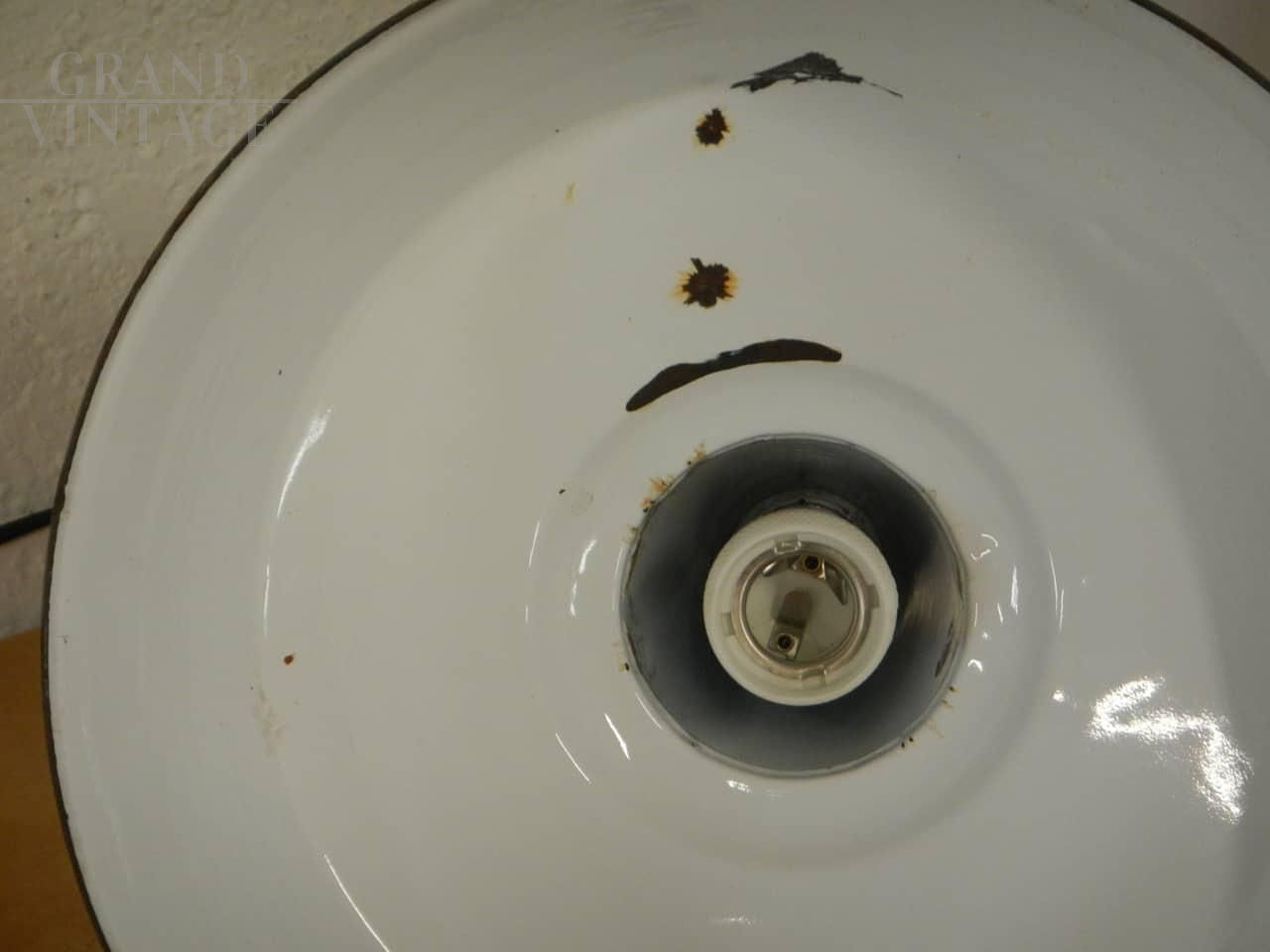 Lampada industriale a sospensione a imbuto in metallo nero con interno bianco, anni '50, con impianto elettrico ricablato e funzionante, attacco per lampadina E27. In buone condizioni con naturali segni d'uso, venduto senza lampadina.
