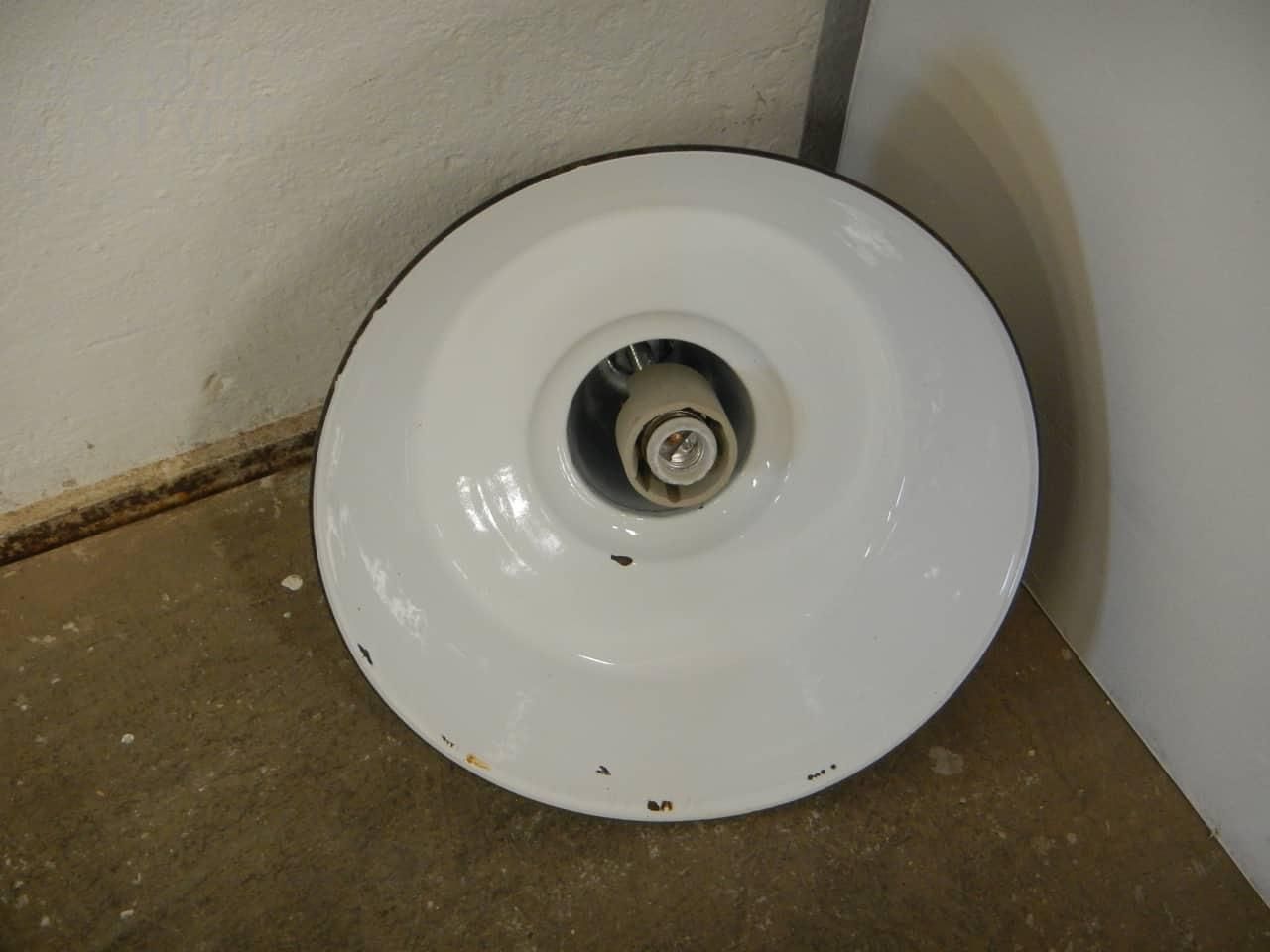 Lampada a sospensione industriale vintage in metallo nero con interno bianco, gancio in ceramica, diametro di 50 cm. Impianto funzionante con attacco per lampadina di tipo E27. Presenta i naturali segni d’uso.