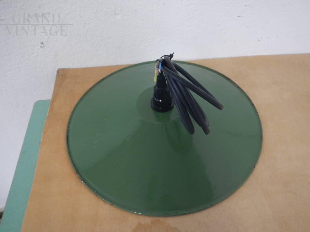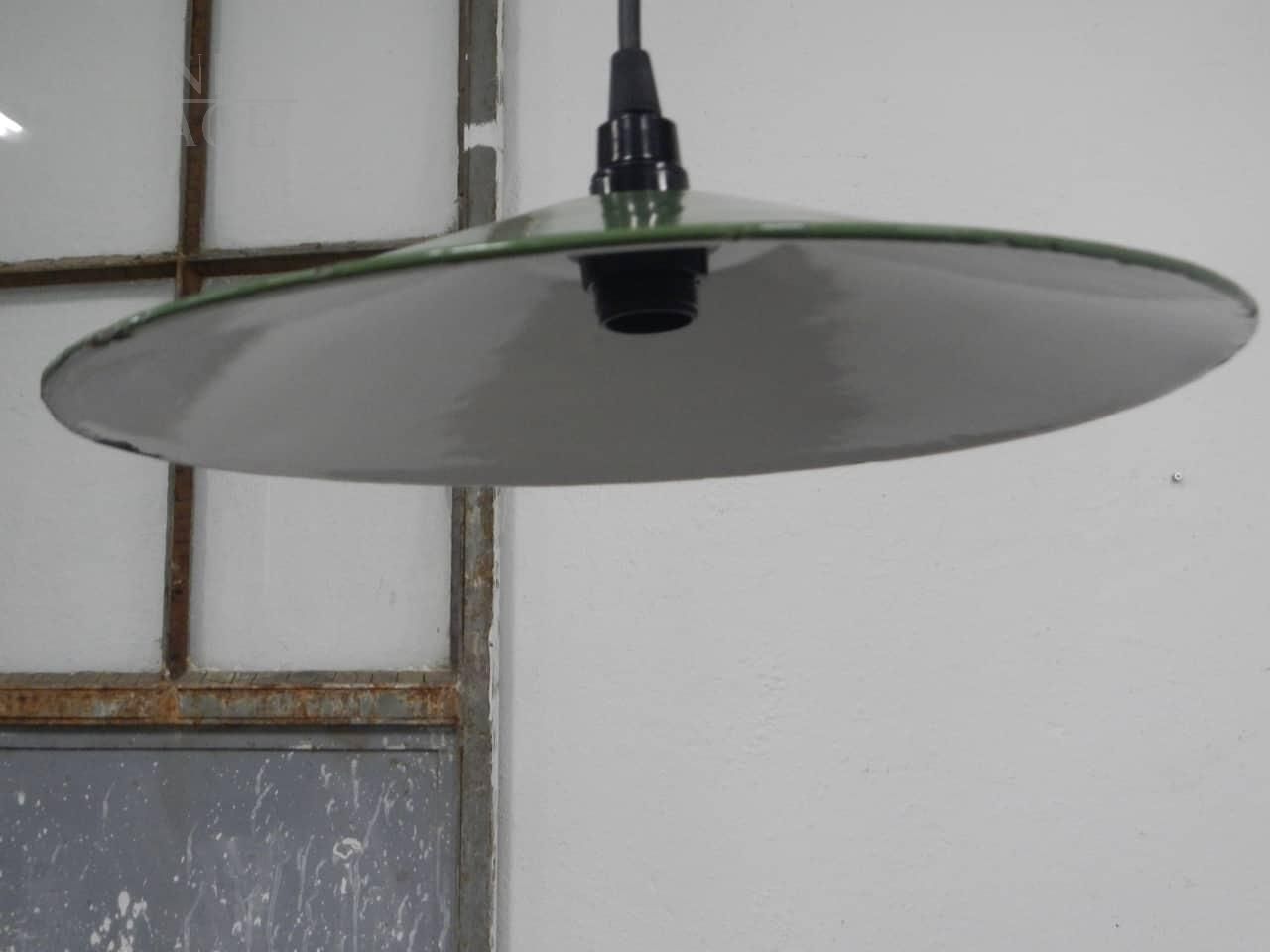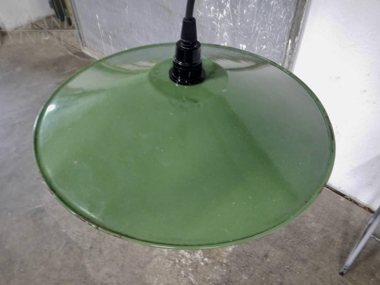 Lampada industriale francese a piattino in metallo verde chiaro con interno bianco, anni '40, impianto elettrico rifatto con attacco per lampadina E14. In buone condizioni con segni d’uso. Disponibili 2 pezzi, il prezzo indicato si riferisce al singolo pezzo.