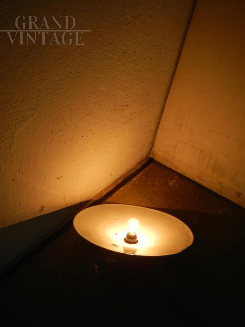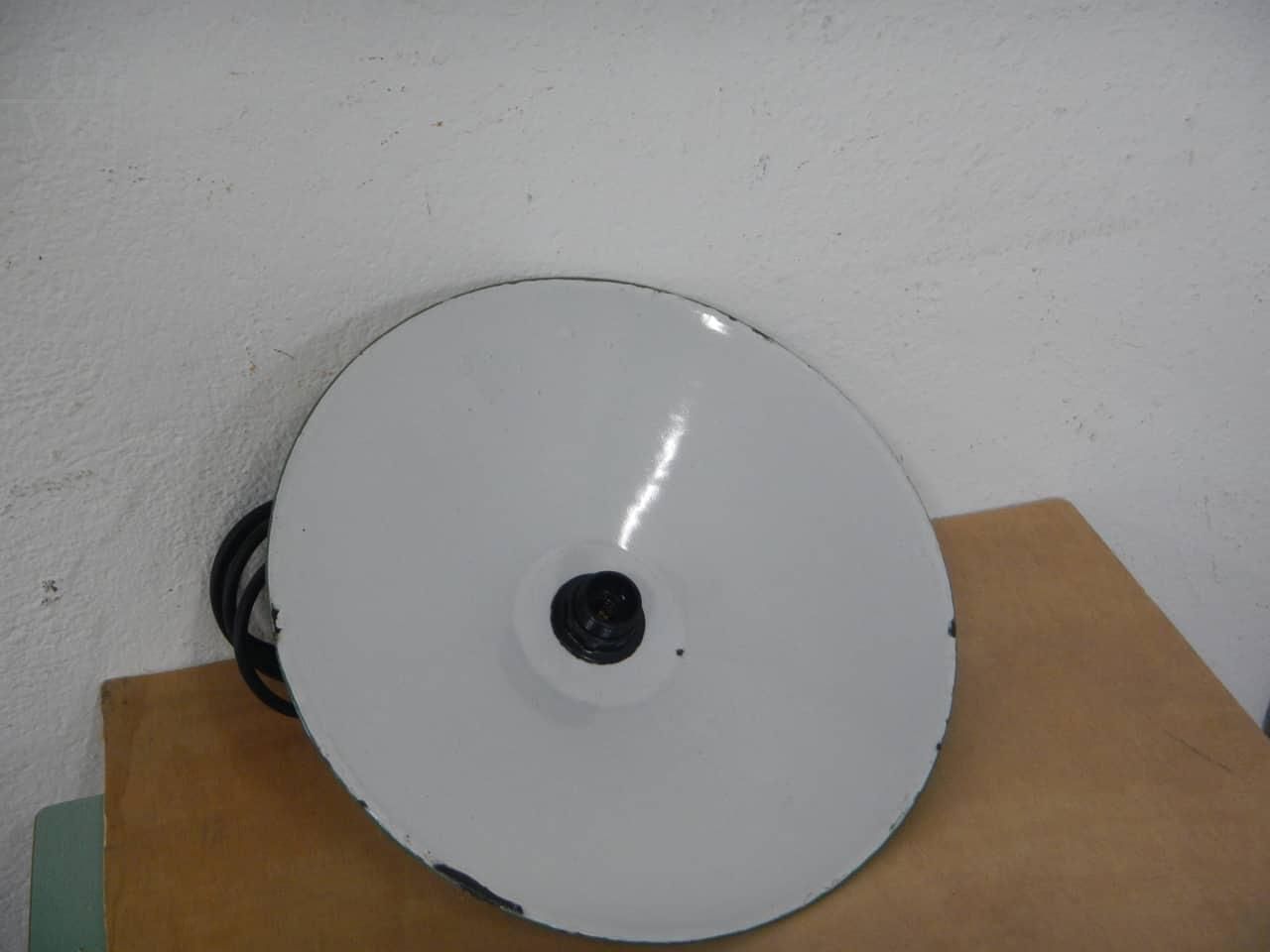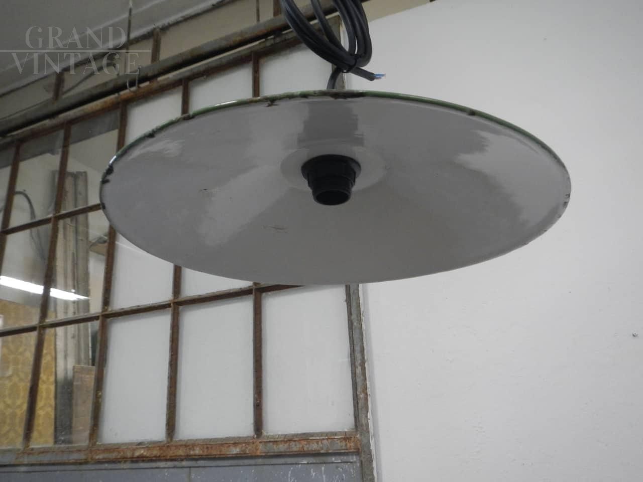 Lampada industriale francese a piattino in metallo verde chiaro con interno bianco, anni '40, impianto elettrico rifatto con attacco per lampadina E14. In buone condizioni con segni d’uso. Disponibili 2 pezzi, il prezzo indicato si riferisce al singolo pezzo.