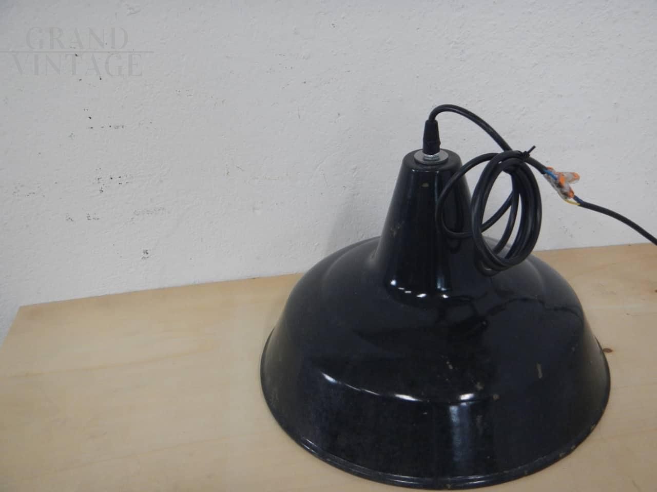 Lampada industriale a sospensione a imbuto in metallo nero con interno bianco con diametro 34 cm, anni '40, impianto elettrico con attacco per lampadina E27. In buone condizioni.