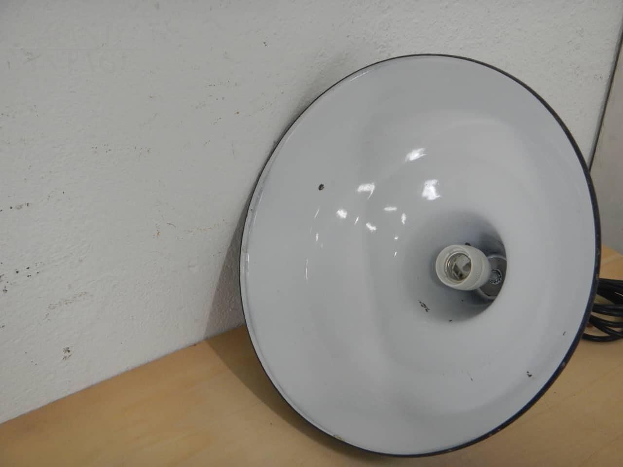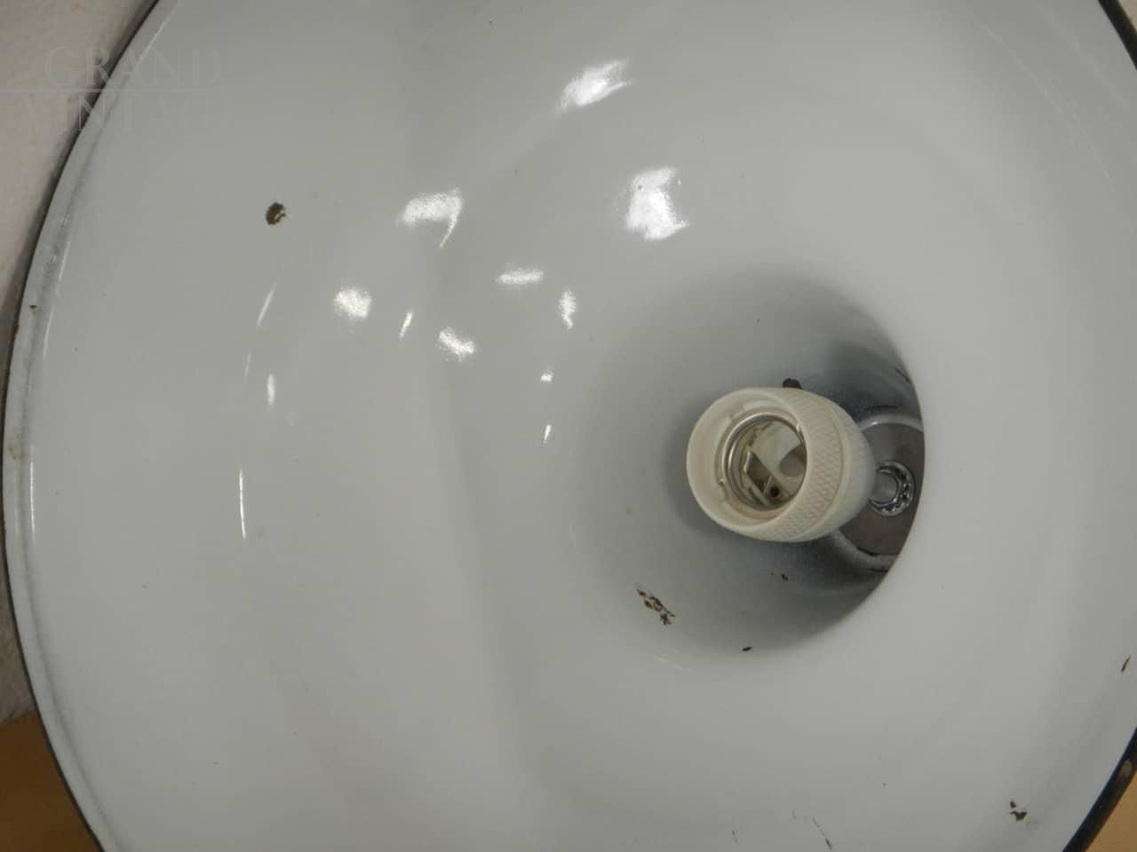 Lampada industriale a sospensione a imbuto in metallo nero con interno bianco, anni '40, diametro 40 cm, impianto elettrico ricablato e funzionante, attacco per lampadina E27. In buone condizioni.