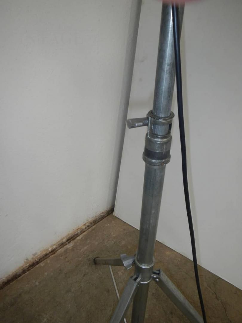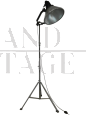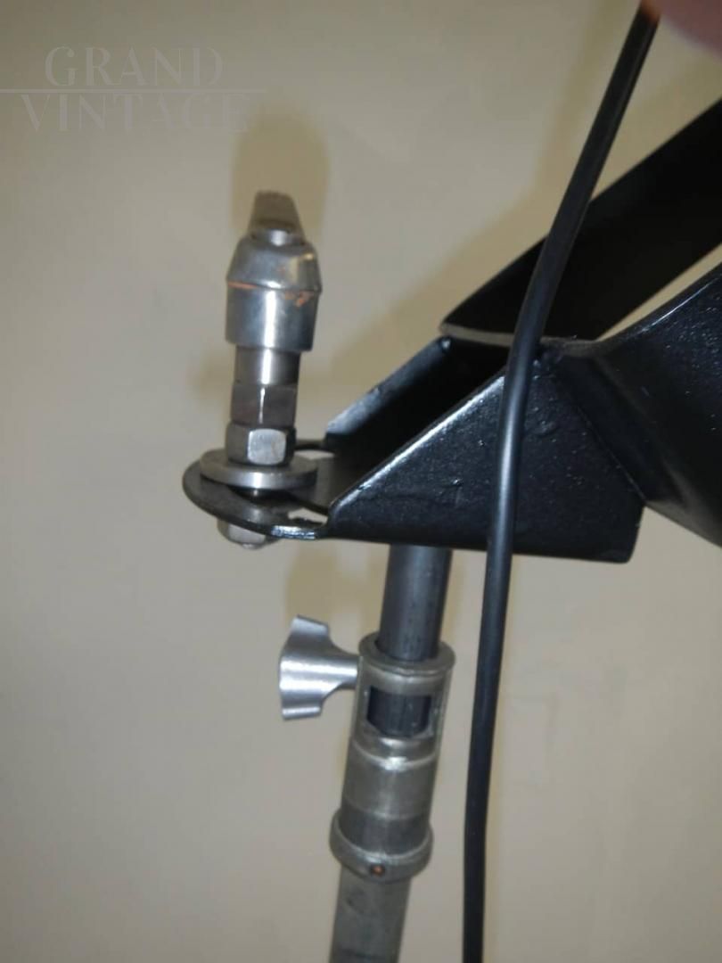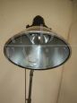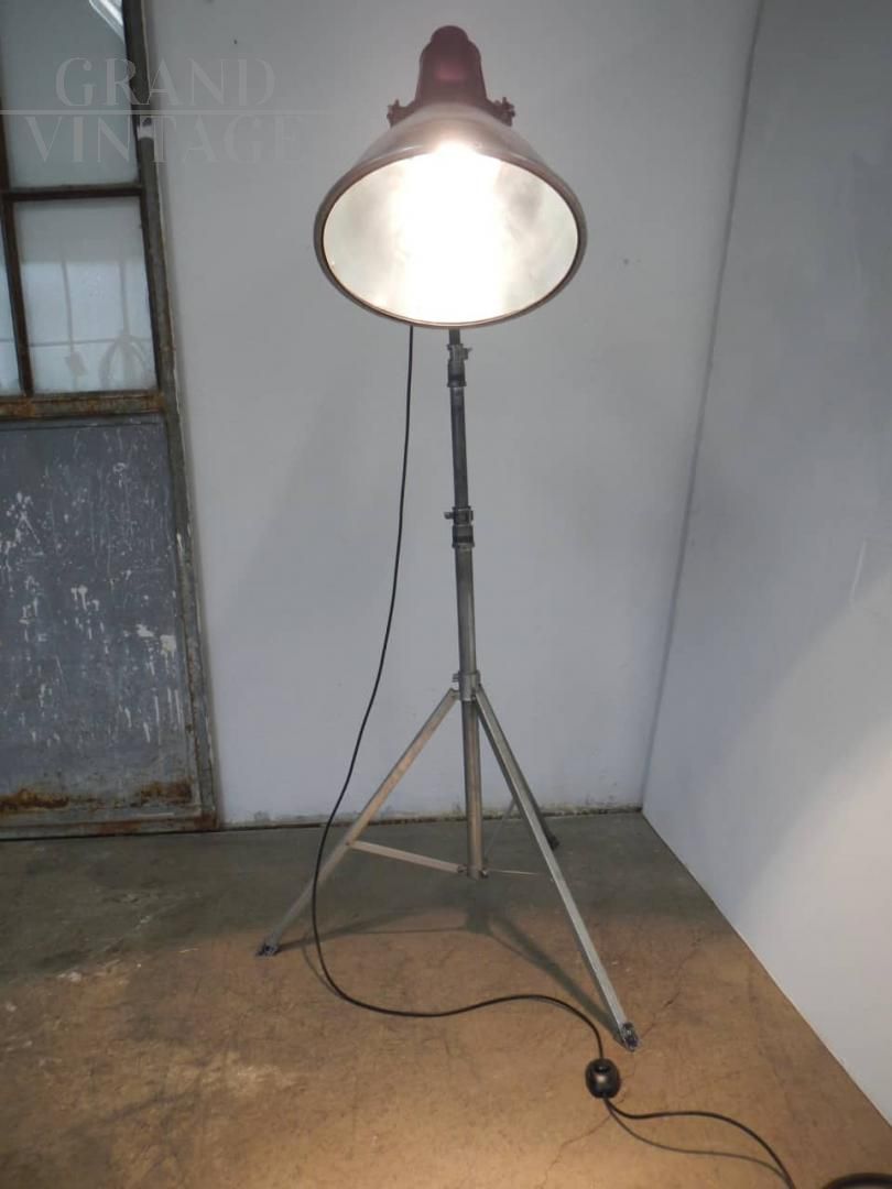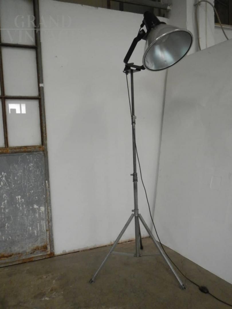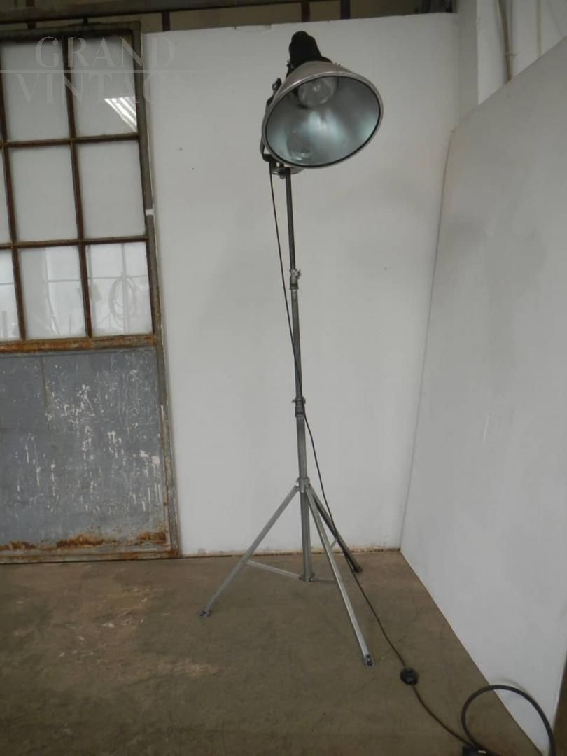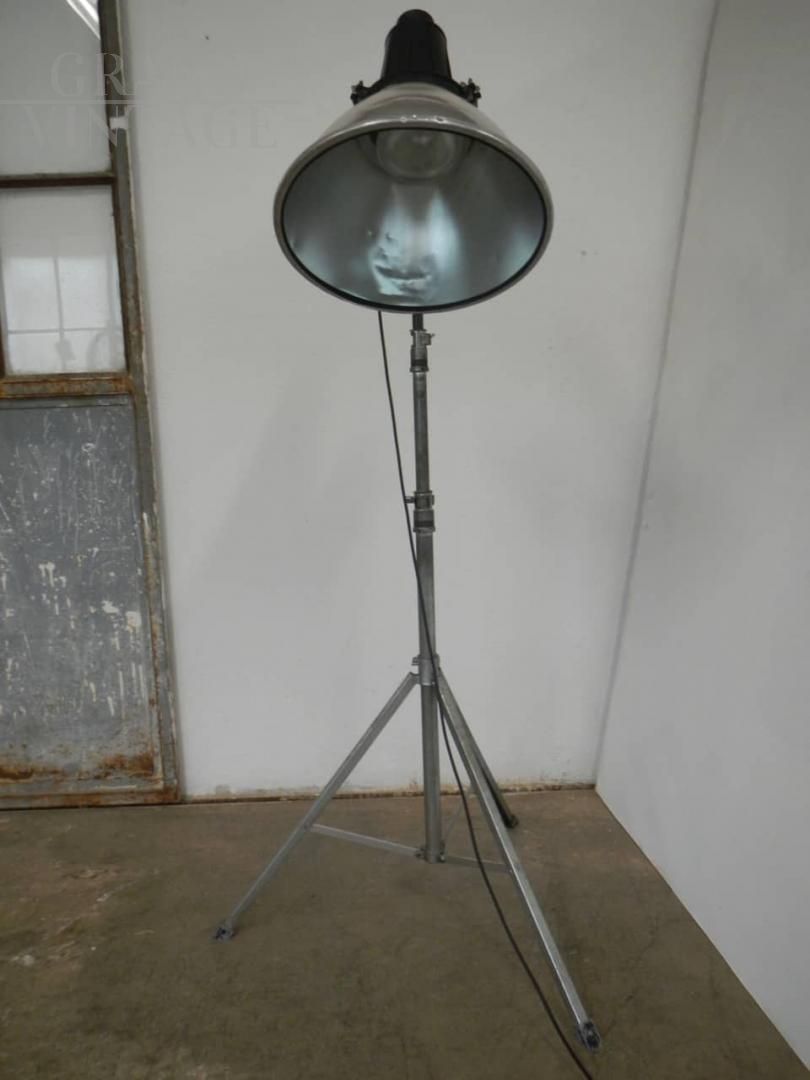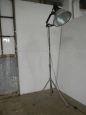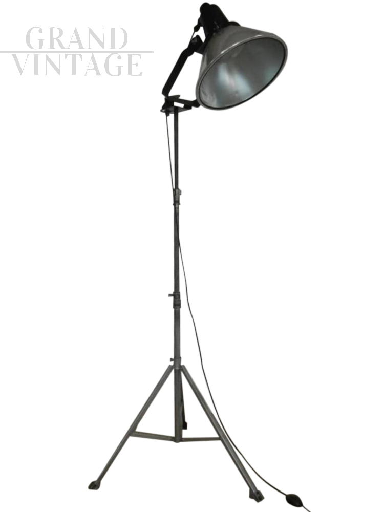 Lampada industriale vintage restaurata e funzionante anni '70 con cavalletto in metallo, misura regolabile in altezza da cm 158 a cm 205.