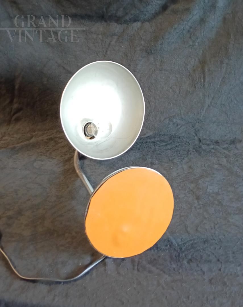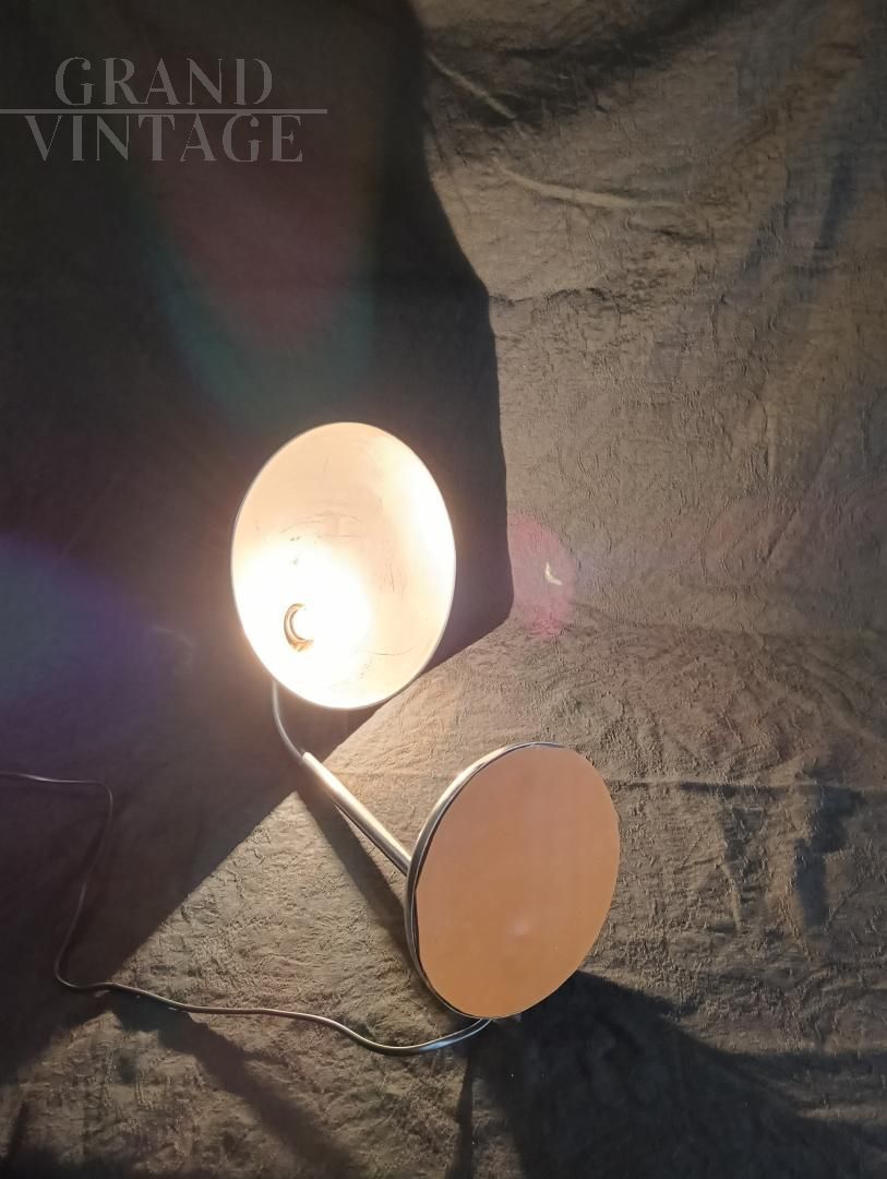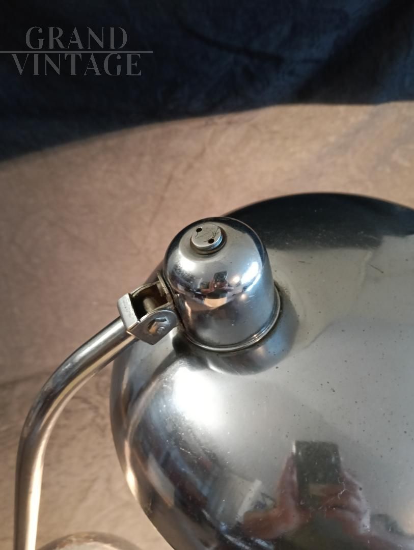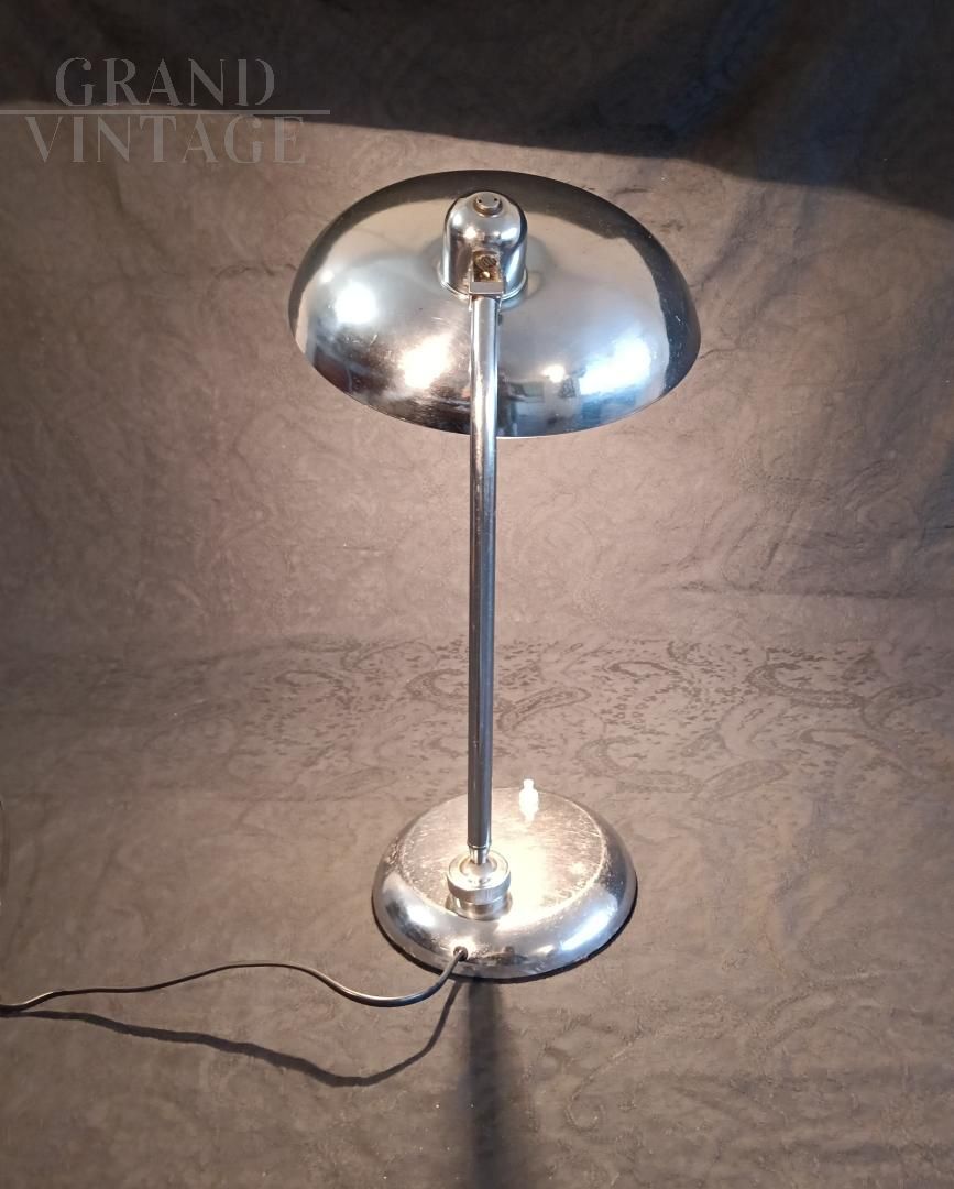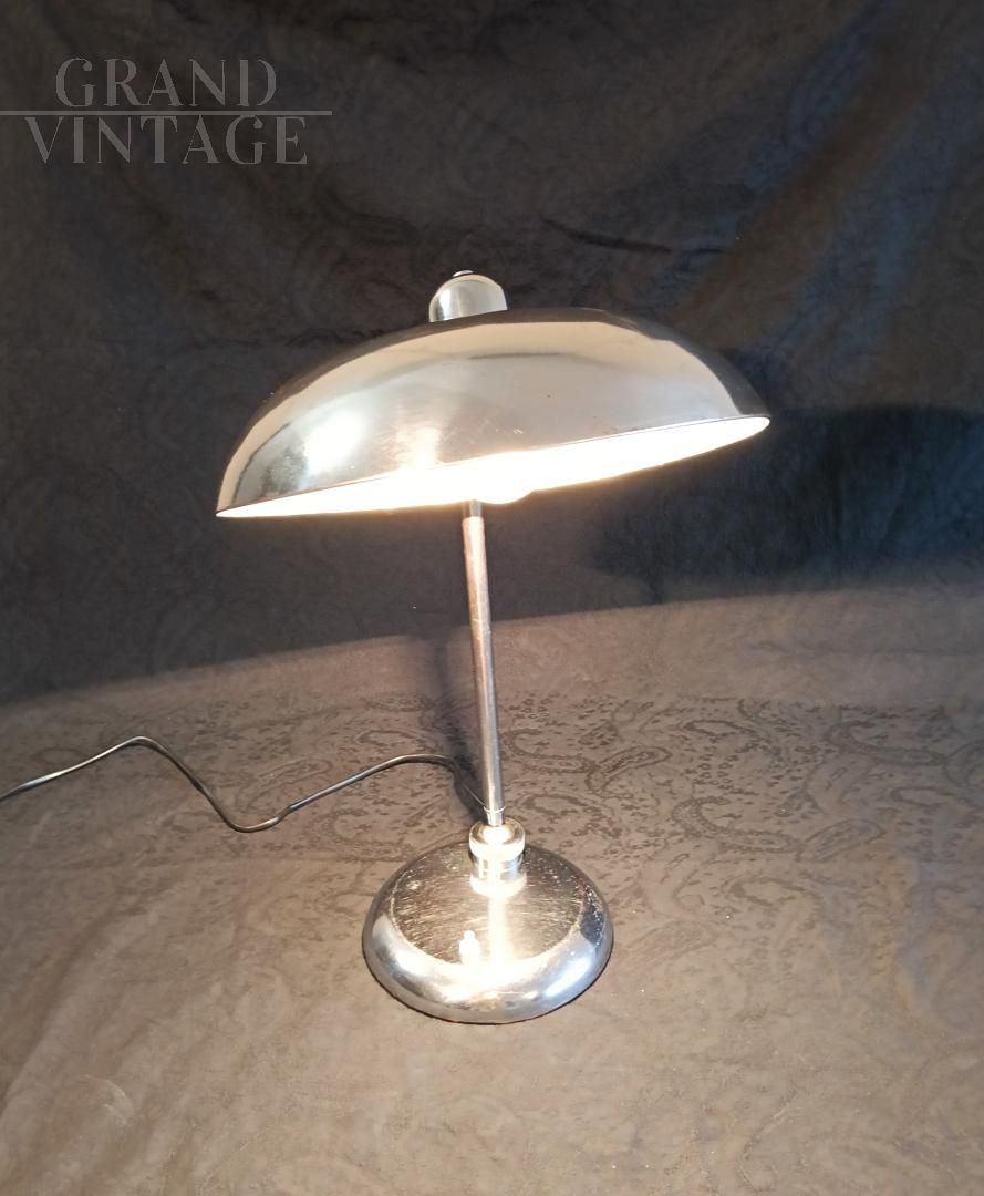 Lampada da tavolo Ministeriale, anni '40 / '50 attribuita a Giovanni Michelucci per Lariolux, realizzata in ottone nichelato, orientabile nei vari sensi di utilizzo. Interruttore sulla base, attacco per lampadina di tipo e27. Ricablata e funzionante, sotto alla base è stato incollato un cuoio per non rovinare il tavolo. La lampada porta i naturali segni d'uso.