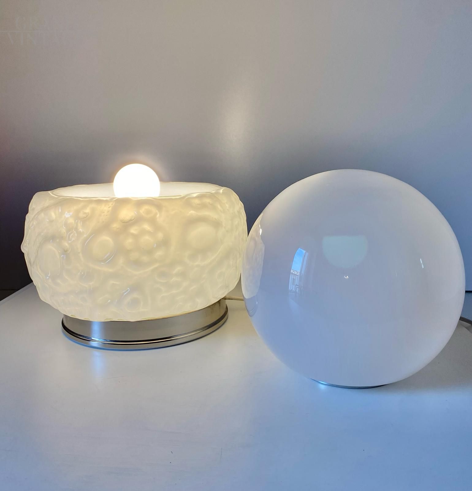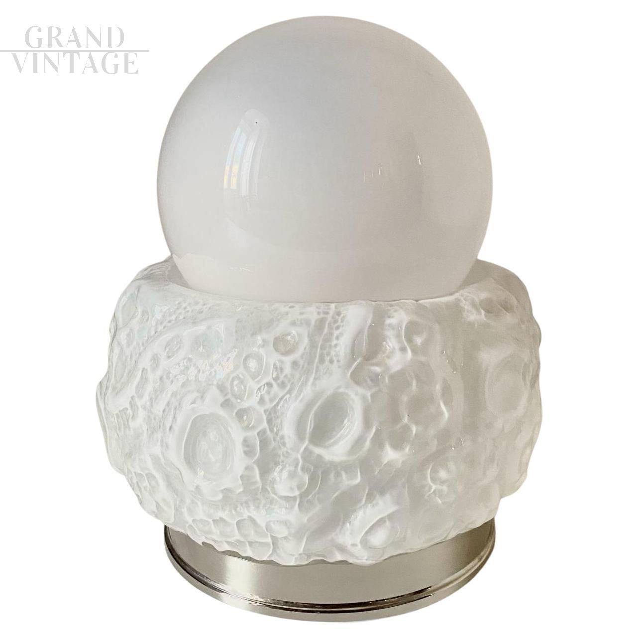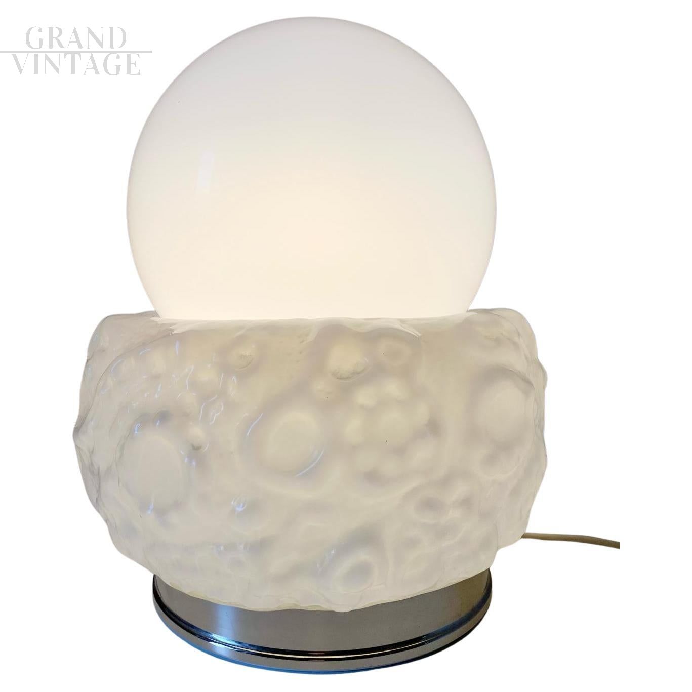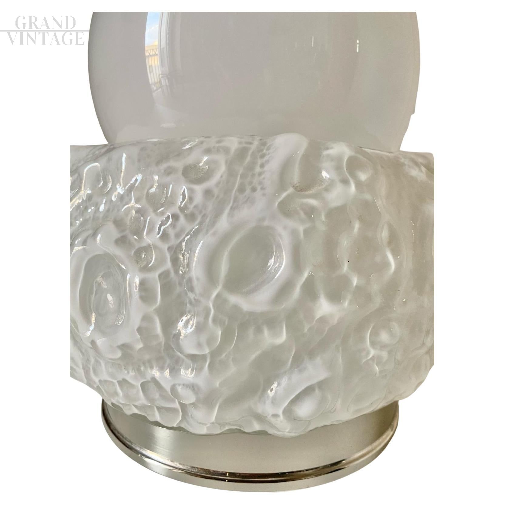 Lampada da tavolo design Osso di Carlo Nason per Mazzega in vetro di Murano bianco, Italia anni '70 in stile space age, con struttura circolare con base in acciaio e vetro di Murano finemente lavorato e sfera in vetro di Murano, removibile su parte superiore. Intatta e perfettamente funzionante, con piccoli segni del tempo sulle parti in metallo.