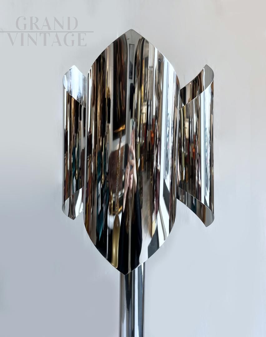 Lampada piantana design attribuita a François Monnet realizzata interamente in acciaio dall'azienda Uginox, dotata di tre punti luce, modernariato anni '70.