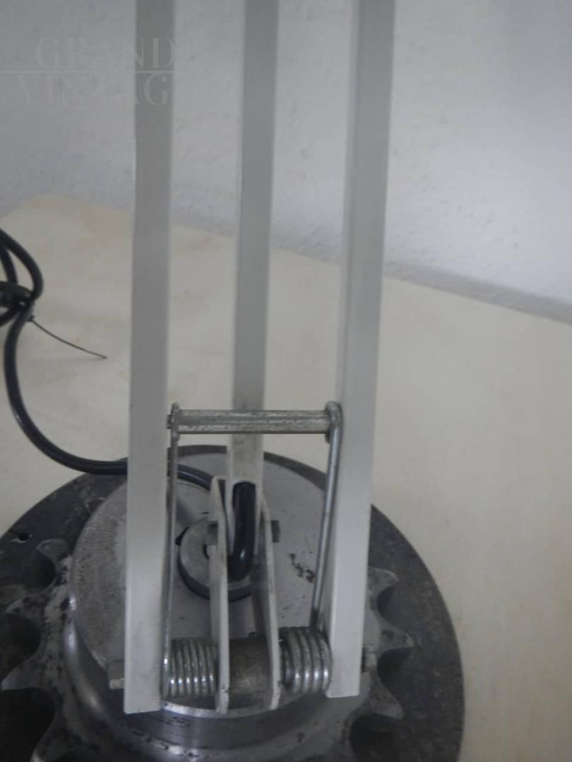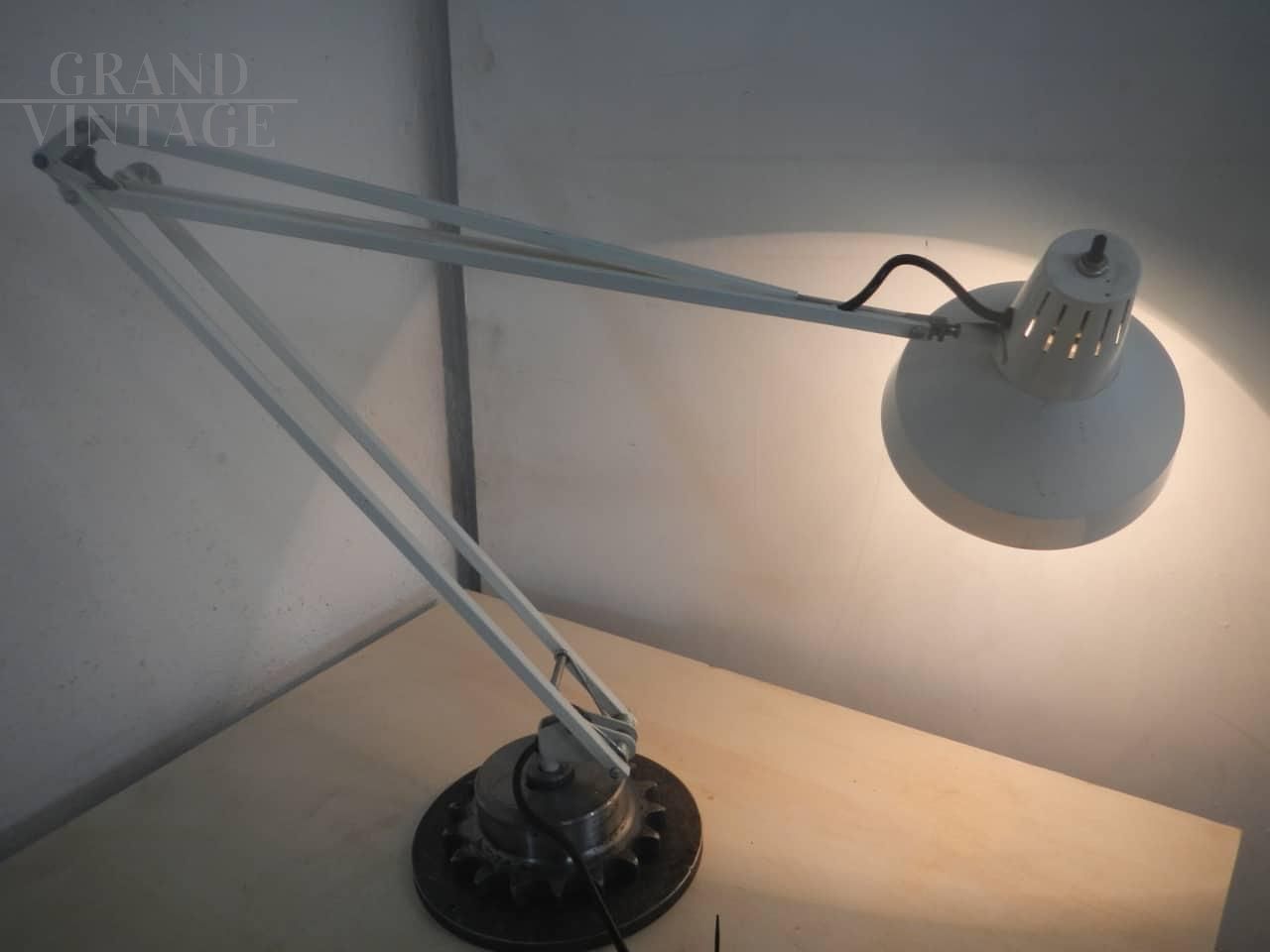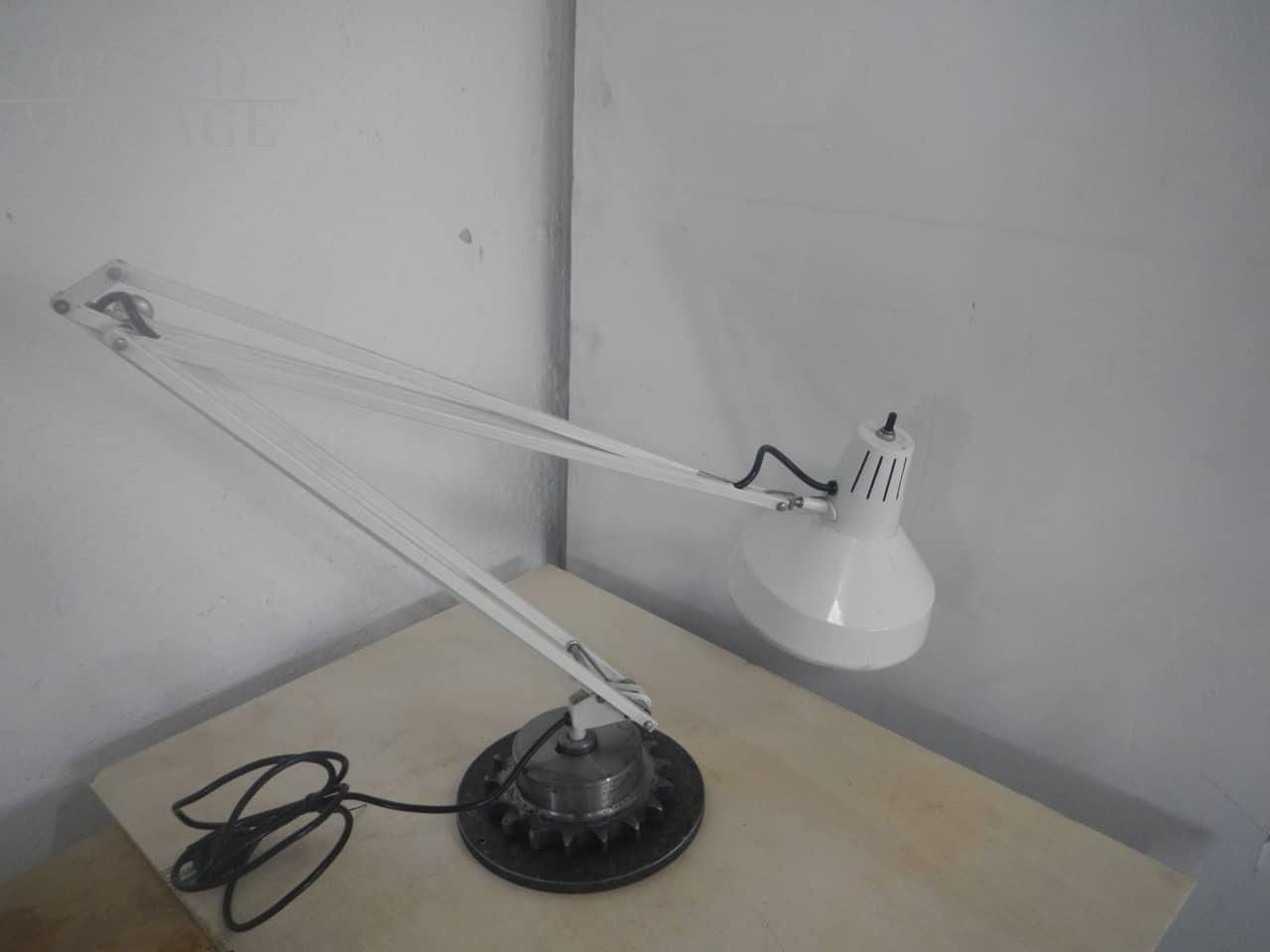 Lampada da tavolo o da scrivania vintage in stile industriale in metallo laccato bianco, alla base è stato applicato un supporto metallico a ingranaggio. Funzionante con pulsante a rotazione per accensione e spegnimento, regolabile in varie altezze. Diametro campana 16 cm. In buone condizioni.