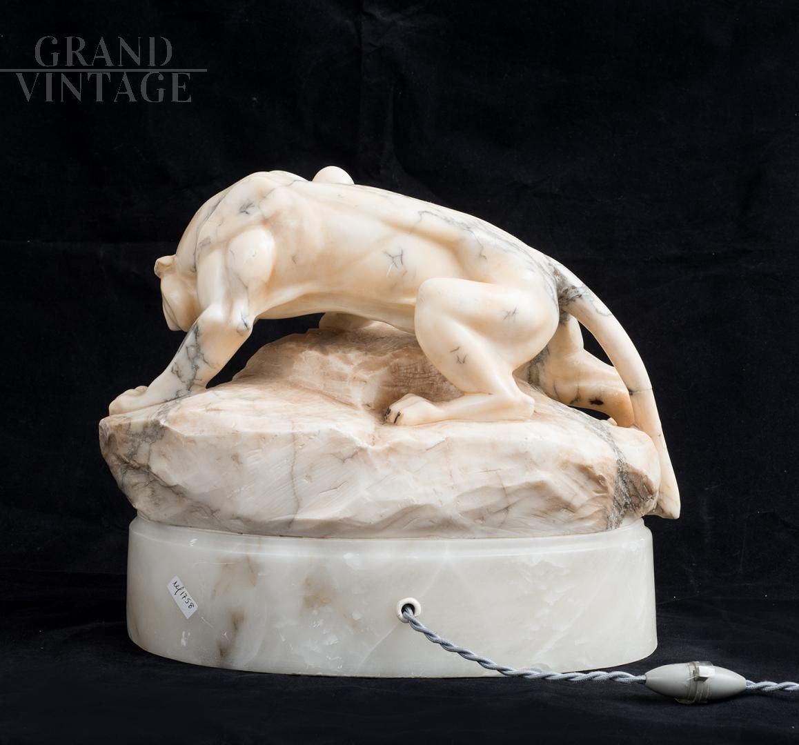 Scultura antica di epoca Napoleone III in alabastro fiorito, in un secondo momento trasformata in lampada, raffigurante una potente pantera. La postura è coinvolgente, con le zampe posteriori piegate, coda stesa verso il basso e il corpo in posizione obliqua, mentre si arrampica su una grotta, trasformata poi in secondo momento come alloggio per una lampada. Le fauci sono spalancate e mostrano i denti dell’animale.