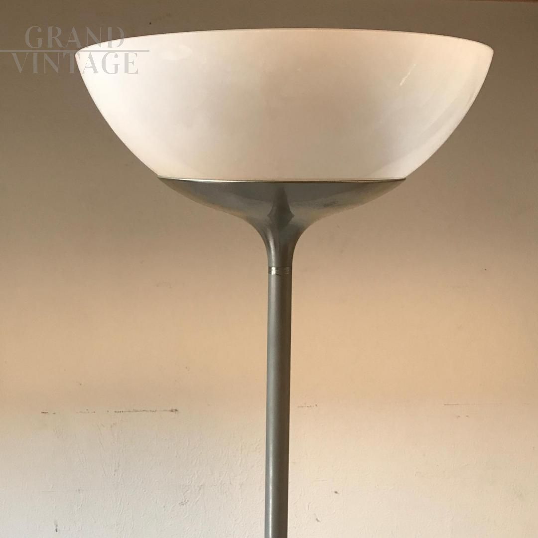 Lampada da terra design by Emma Gismondi Schweinberger per Artemide, con struttura in ottone opaco e vetro bianco opalino. Anni '60.