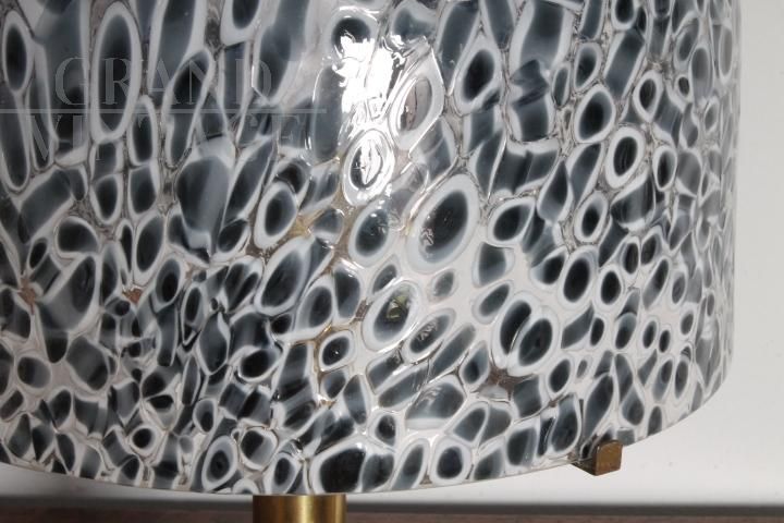 Bellissima lampada da tavolo della bottega Vistosi in ottone con cupola paralume in vetro di Murano con murrine bianche e nere, anni '70. Impianto elettrico revisionato.