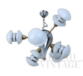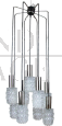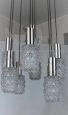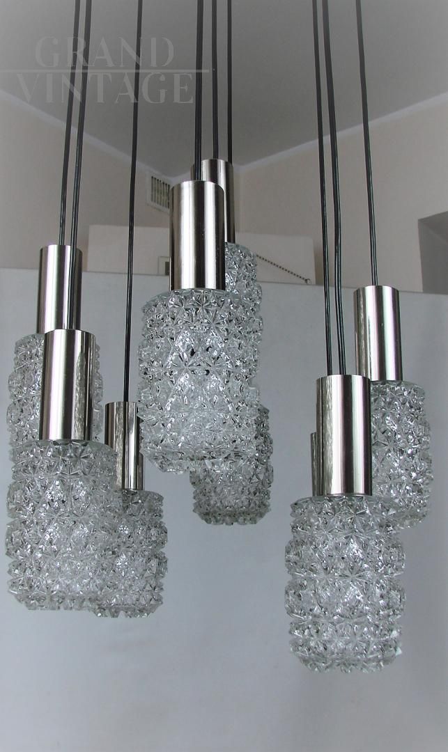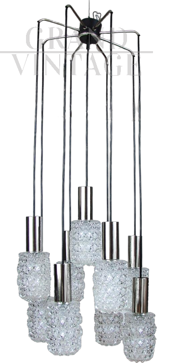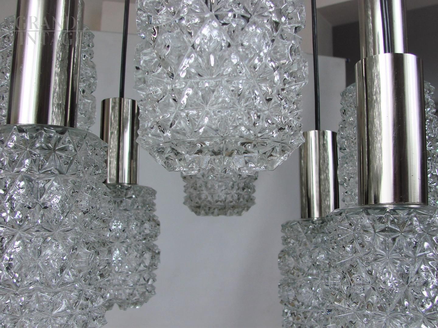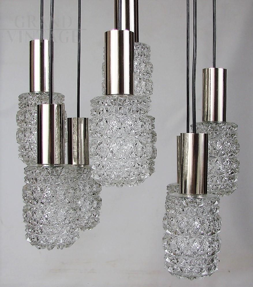 Lampadario a cascata modello 421 di Bauhamp Leuchten Neheim, con struttura in acciaio cromato e luci in vetro effetto rostrato. Il lampadario richiede 9 lampadine E14.
