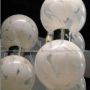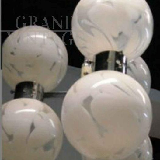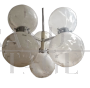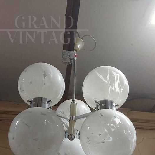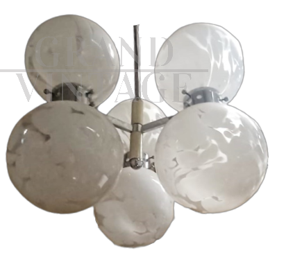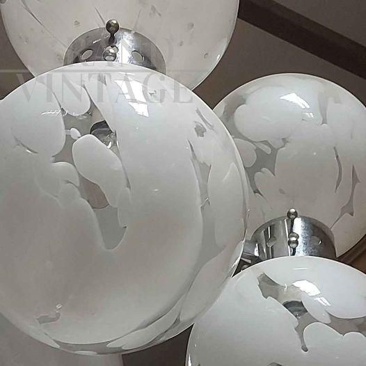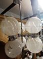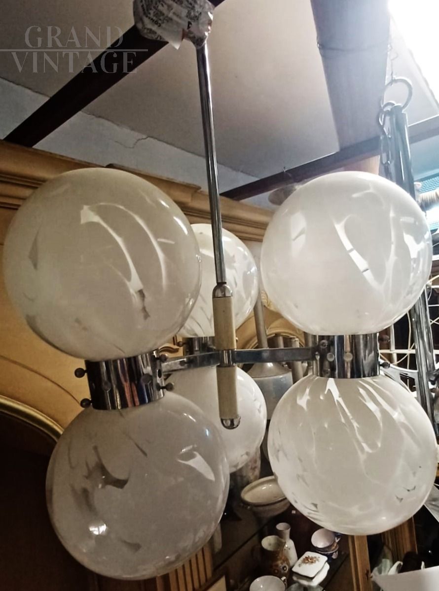 Lampadario a 6 luci in vetro di Murano di Carlo Nason per Mazzega, anni '70, color latteo, struttura cromata con parti cromate e parti laccate bianche. Buonissimo lo stato di conservazione, bellissimo l‘effetto una volta acceso.