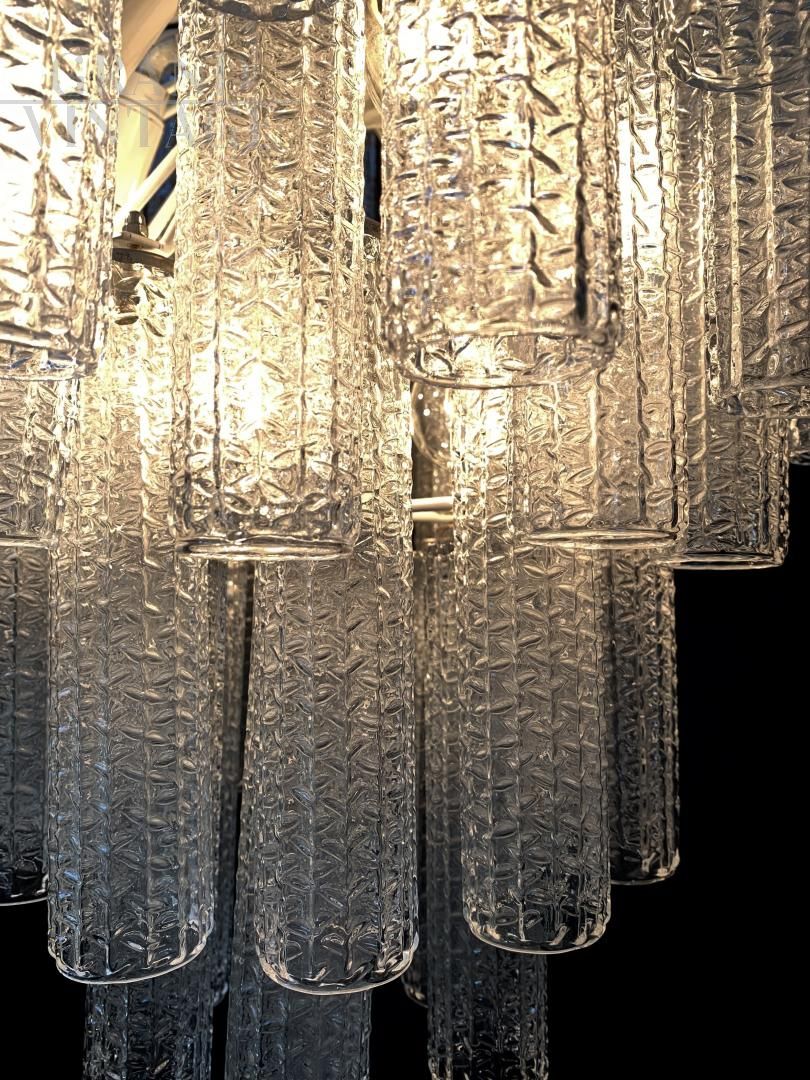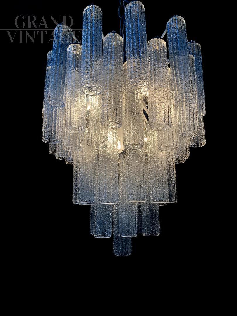 Fantastico lampadario degli anni 1970 circa, tutto originale e con impianto elettrico rifatto. Attributo alla ditta Venini, vetri non crepati. Da notare i bellissimi e famosi tubi inseriti in questo elegante lampadario. Color cristallo trasparente. Naturalmente ha i segni del tempo. Dimensioni: Altezza 60 cm, altezza con catena 100 cm, Larghezza 44 cm.
