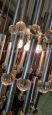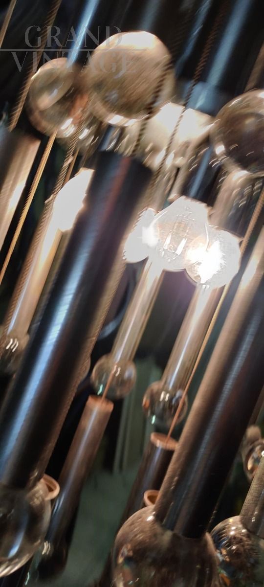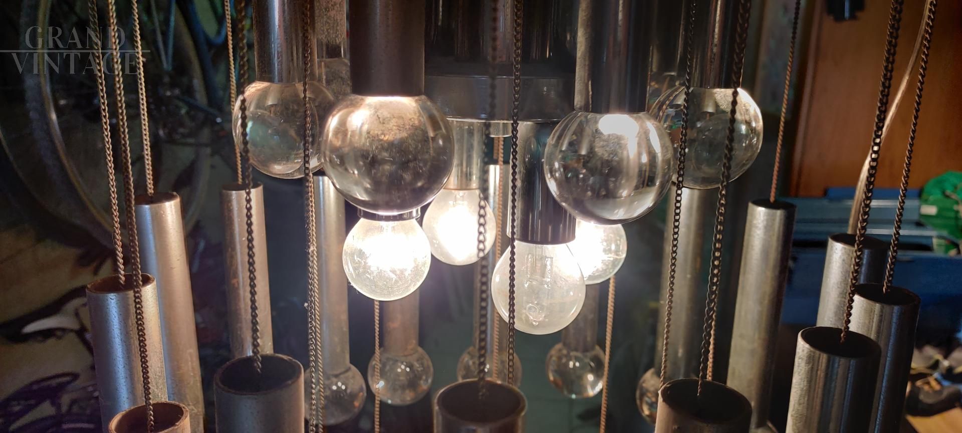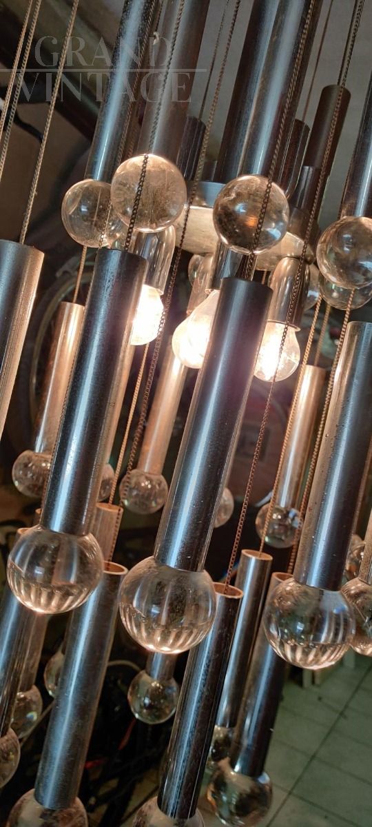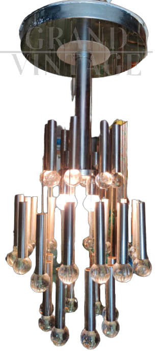 Lampadario anni '70 di design in stile Sciolari a cascata con struttura in acciaio e cristalli, presenta i segni del tempo.