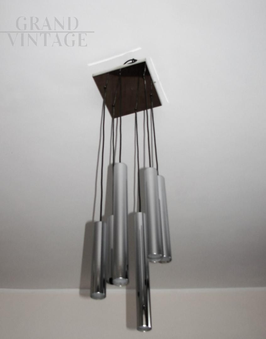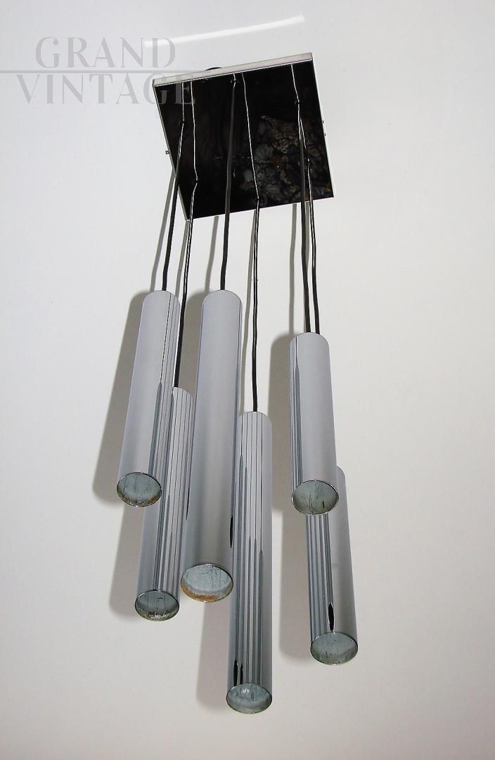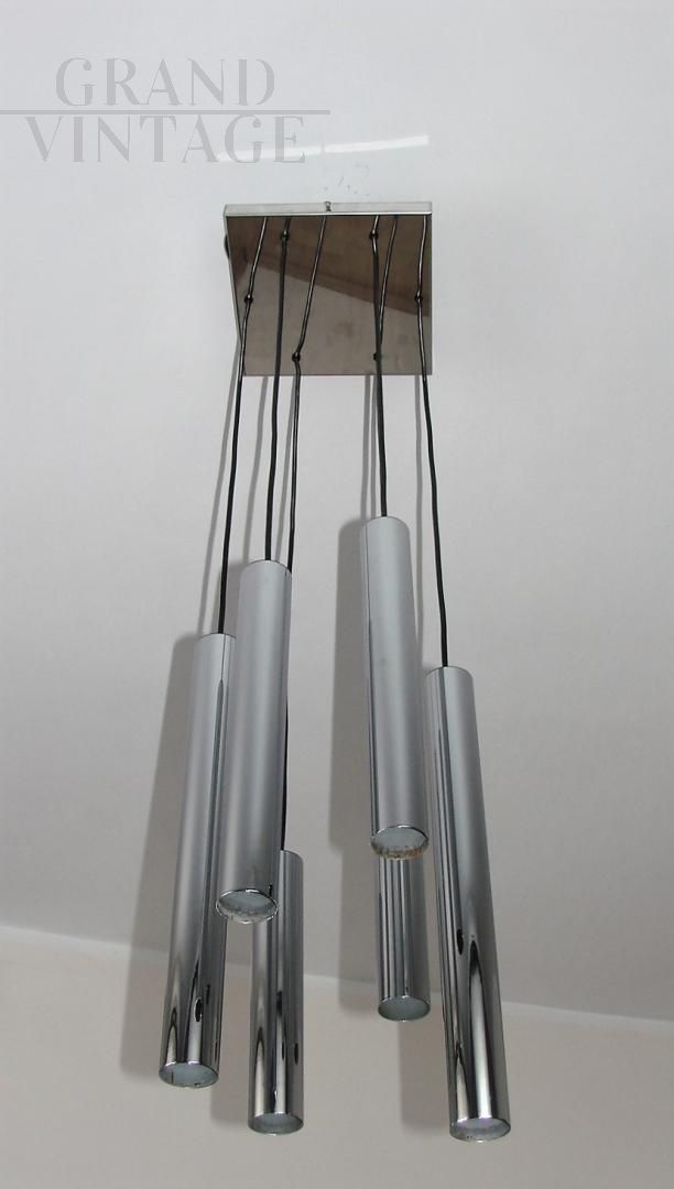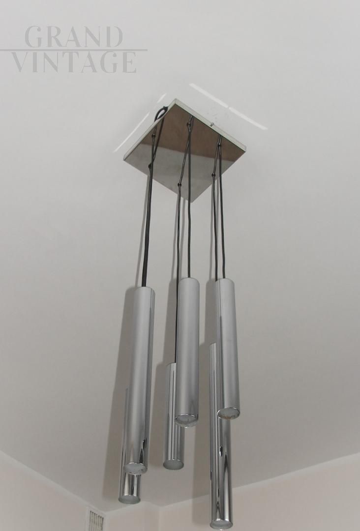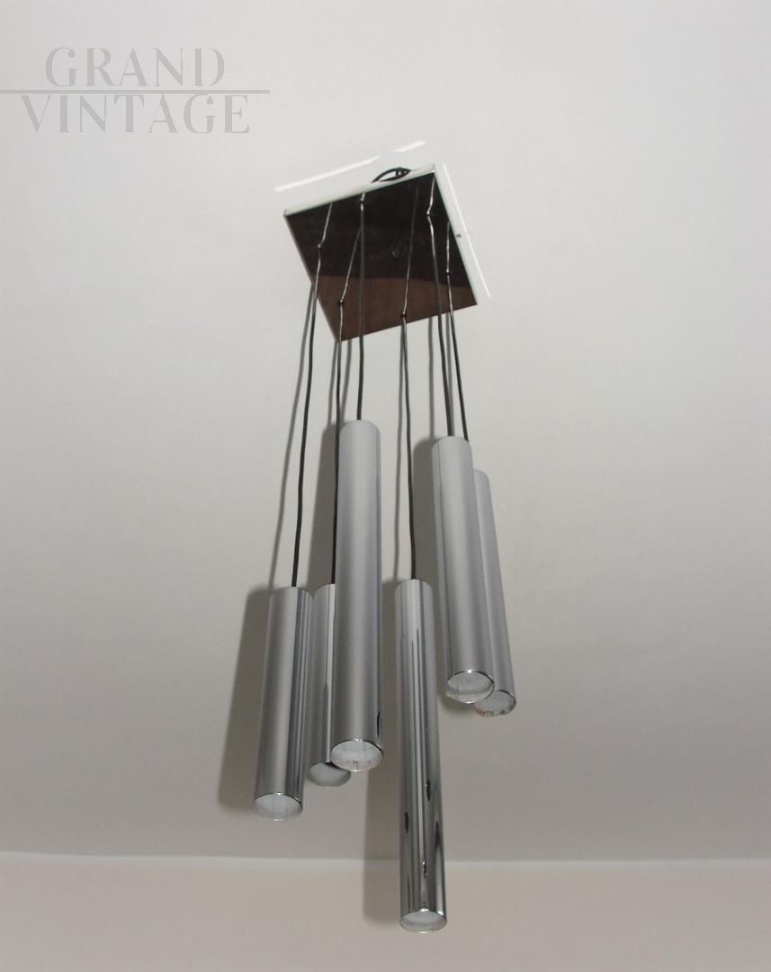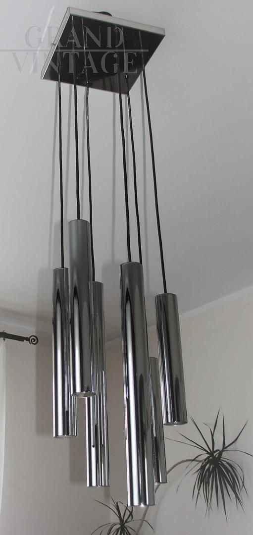 Lampada a sospensione lampadario a cascata anni '70 con tubi in acciaio cromato, è in ottime condizioni vintage e necessita di 6 lampadine E14.