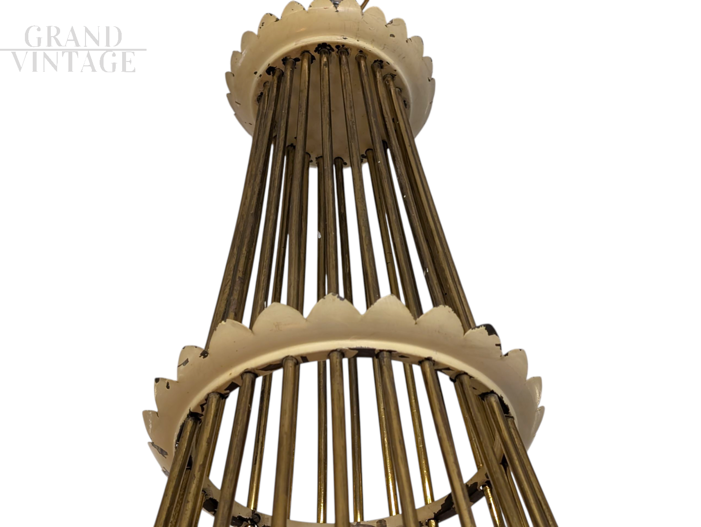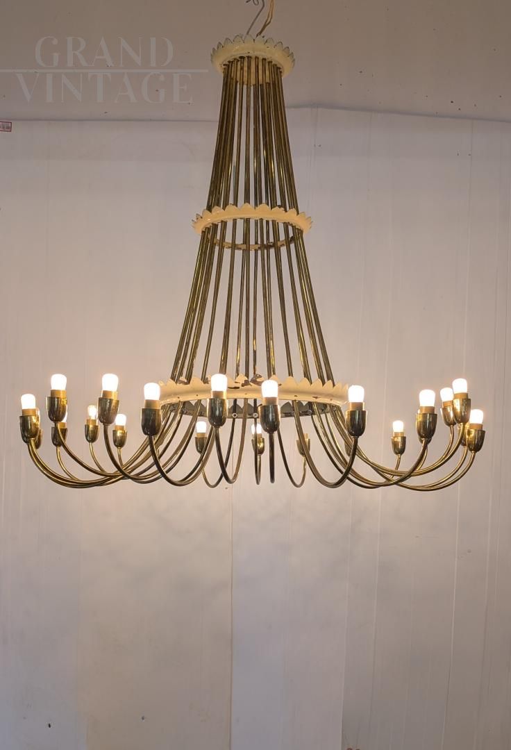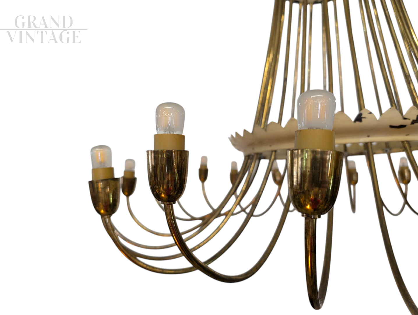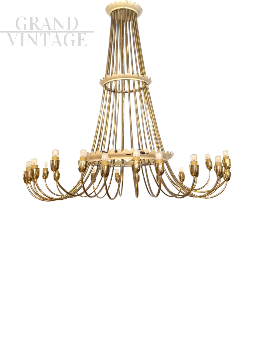Questo sontuoso lampadario in ottone dorato si distingue per il suo design elegante a cascata, con una struttura slanciata e armoniosa che si apre verso il basso in una spettacolare corona luminosa. Dotato di 25 portalampade distribuiti su un unico livello, il lampadario combina maestosità e raffinatezza, ideale per ambienti classici o spazi contemporanei che cercano un tocco di lusso vintage. Le linee arcuate in ottone lucido esaltano la luce calda delle lampadine, creando un’atmosfera accogliente e scenografica. Perfetto per grandi sale, ingressi monumentali o ambienti di rappresentanza. Condizioni ottime, presenta dei segni del tempo e con vernice da rivedere. Si consiglia un restauro da un professionista. Componente elettrica funzionante e testata. Dimensioni 97 x 97 cm