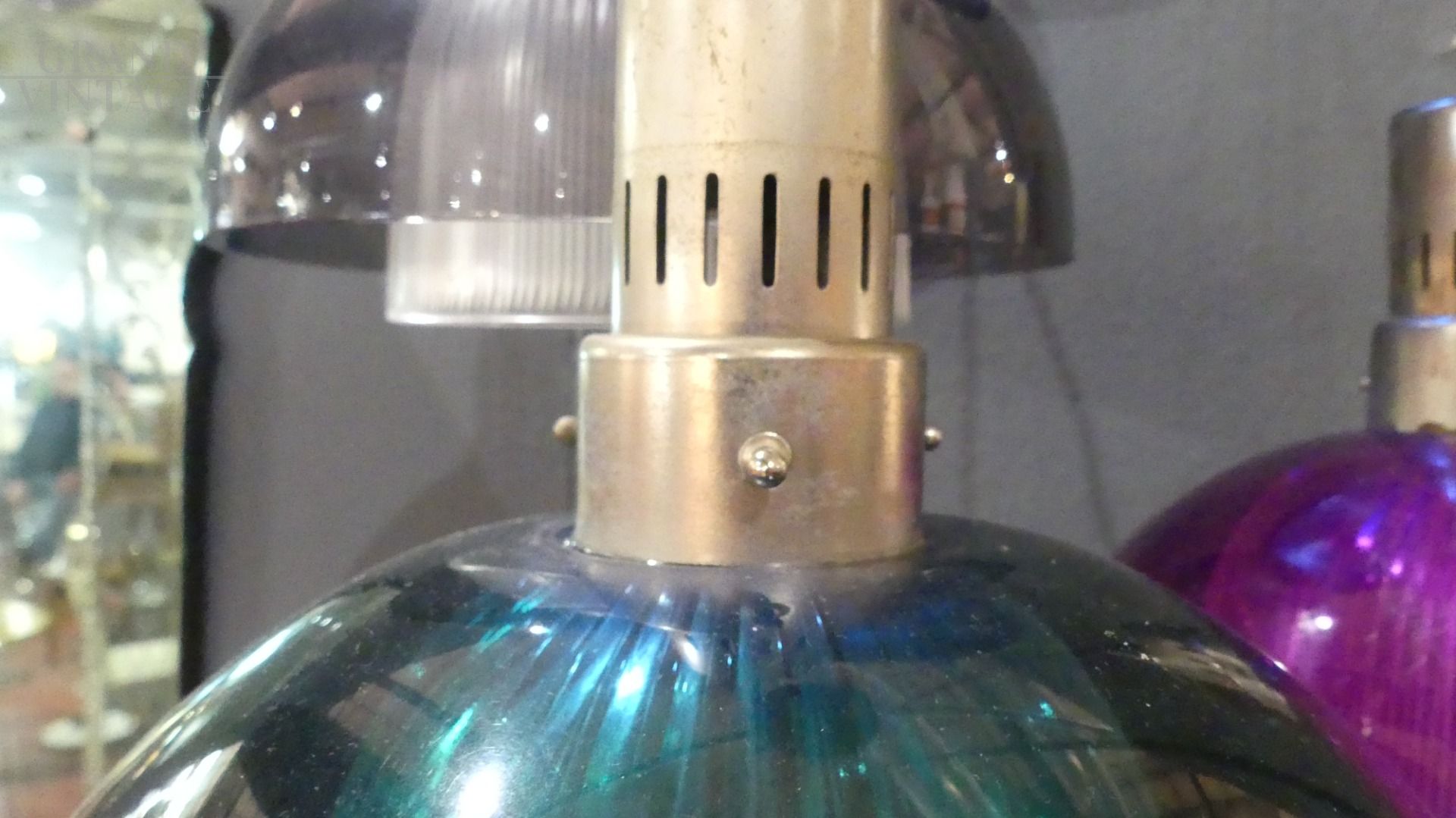 Lampadario a cascata con paralumi in vetro satinato decorati da mezze sfere in plastica multicolore, luminoso e d'effetto, perfetto per dare un tocco di colore all'ambiente. In ottime condizioni.