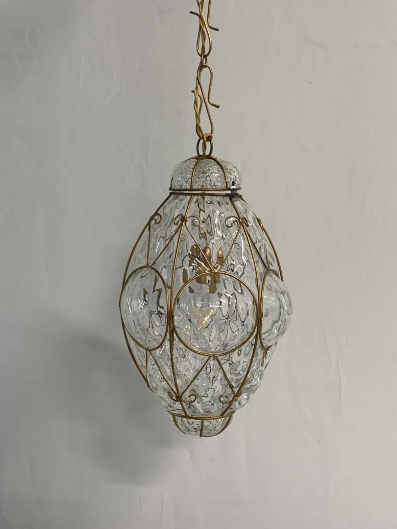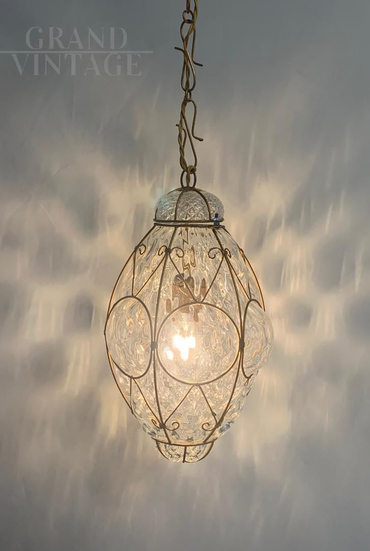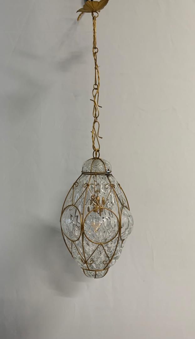 Lanterna sospesa in vetro di Murano di medie dimensioni, elegantemente decorata con una struttura di ottone dorato lavorato a riccioli , che avvolge un corpo in vetro finemente decorato . La lanterna accesa e crea suggestivi giochi di luce sulle pareti circostanti, grazie alla texture del vetro e alla rifrazione luminosa;il cavo e la catena presentano un rivestimento intrecciato dorato che si abbina perfettamente alla struttura della lanterna, conferendole un aspetto classico e raffinato. Ideale per ambienti eleganti come ingressi, salotti o sale da pranzo, questa lanterna unisce artigianato artistico. Lanterna attribuita alla ditta A.V.E.M con impianto elettrico nuovo; ha un portalampada e27. Dimensioni Altezza totale: 82 cm Altezza lanterna: 40 cm Larghezza: 25 cm